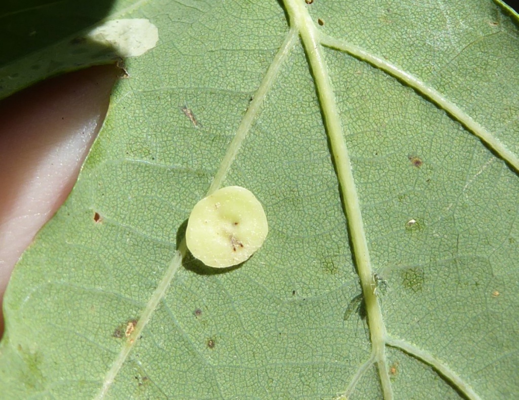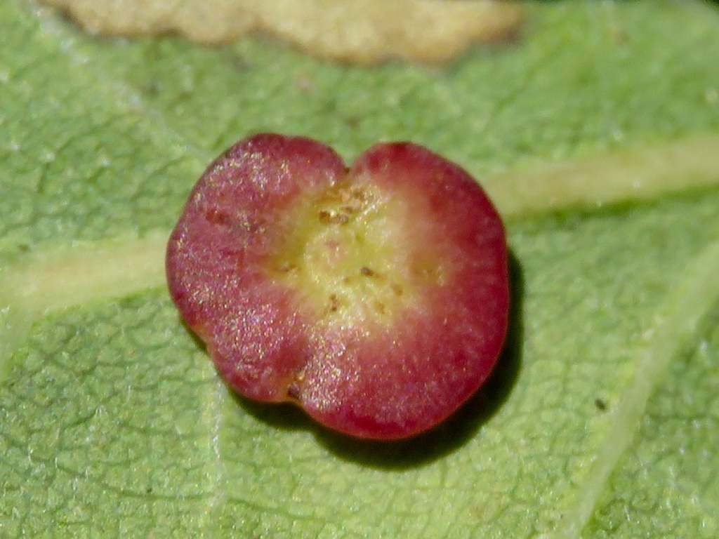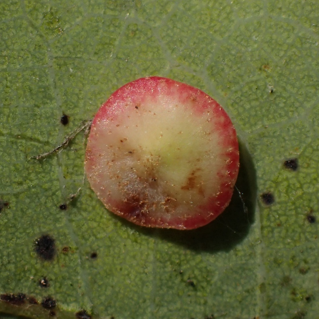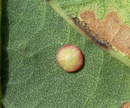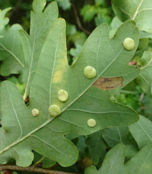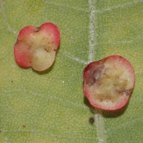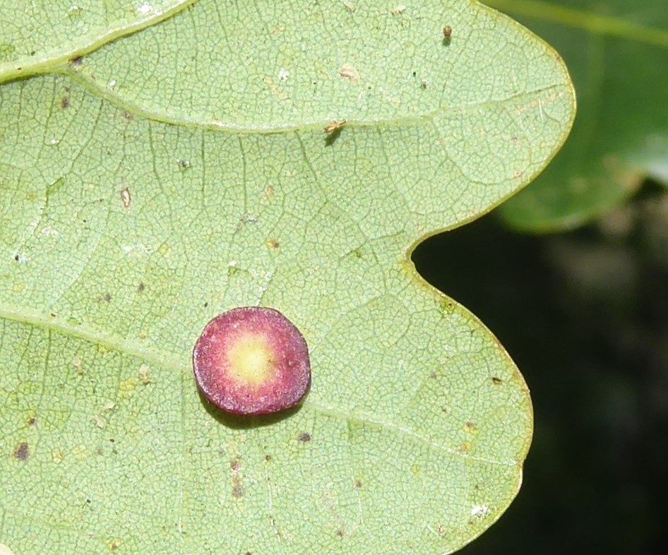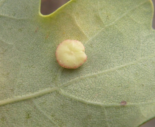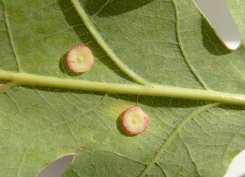 The agamic (asexual) galls are found on the underside of Oak leaves and are thin and flat in shape, hairless with a slightly raised rim, measuring up to 5mm across. The colour is generally cream or pale green, sometimes with a pinky-red rim or blotches. They are rarely found in large numbers on a single leaf.