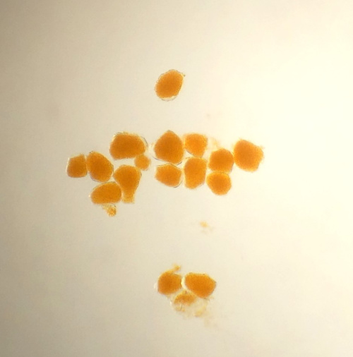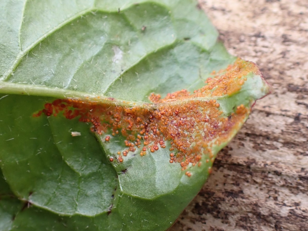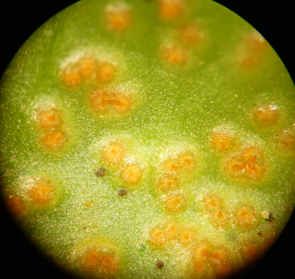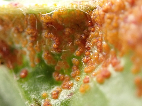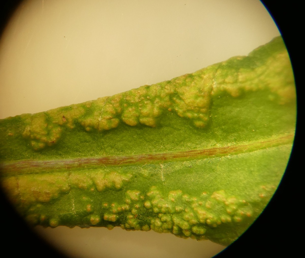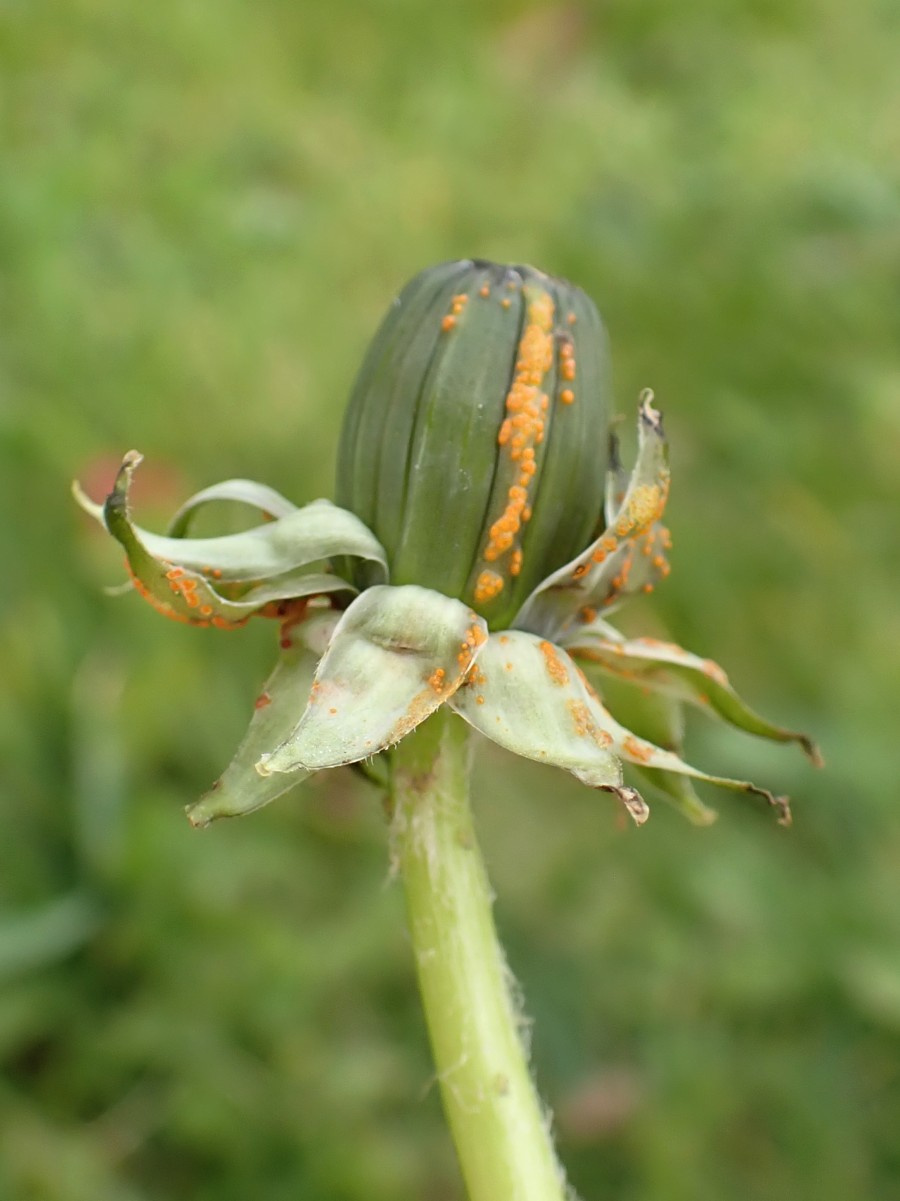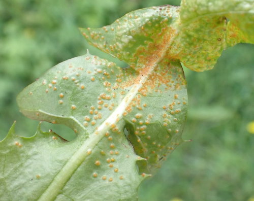 A fungus causing galls on dandelion leaves; numerous small (<1mm) round pustules on both leaf surfaces, pale yellow to orange.