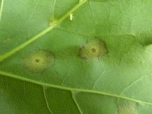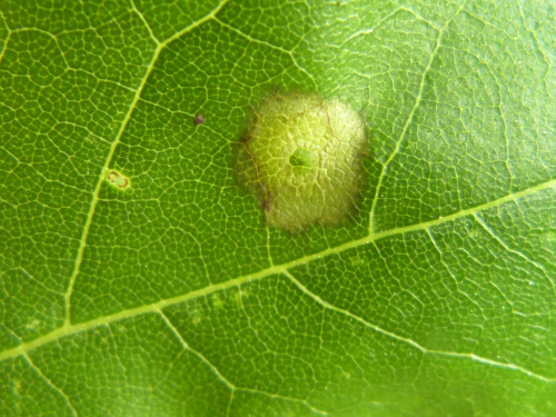 The larvae of the gall midge Acericecis campestre gall the leaves of various members of the family Sapindaceae which include Maples and Sycamore. A single larva lives in a small depression at the underside of the leaf. The upper side has a corresponding small bulge, less than 1mm highwhich is surrounded by a pale yellowish circle. After the larva has vacated the gall, a yellow spot remains then eventually withers. The larva is whitish, almost hyaline, short and squat.