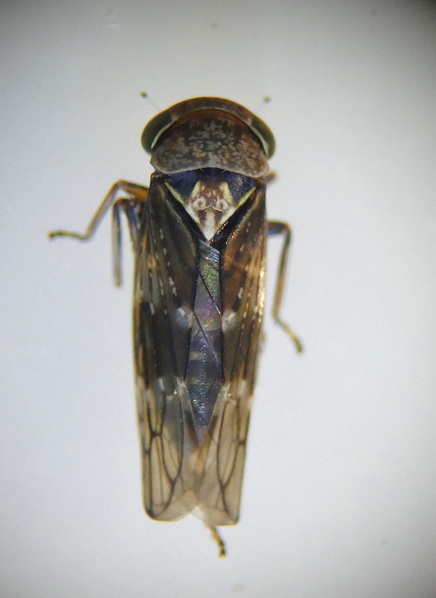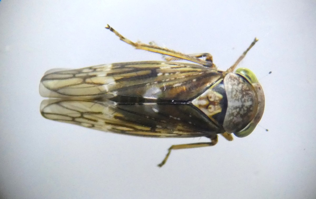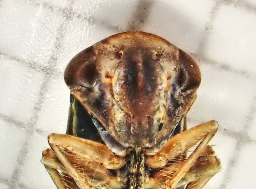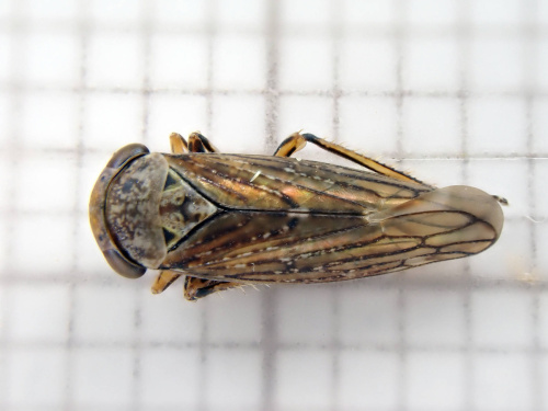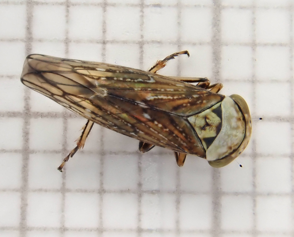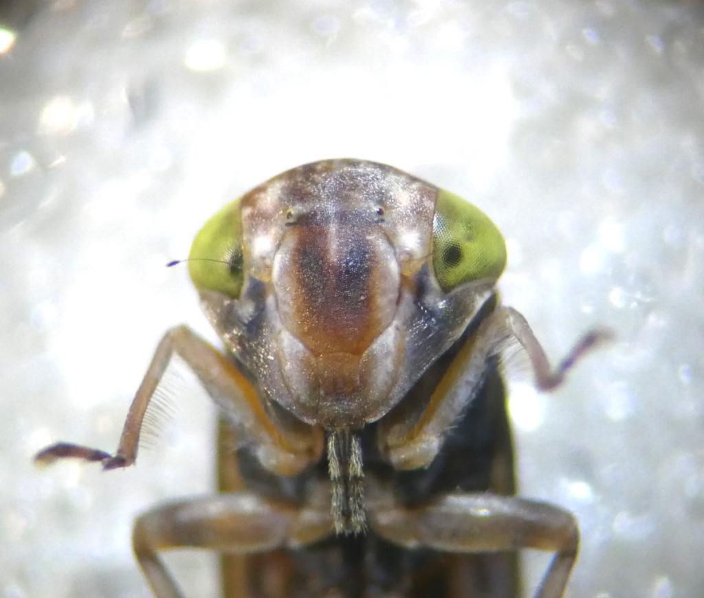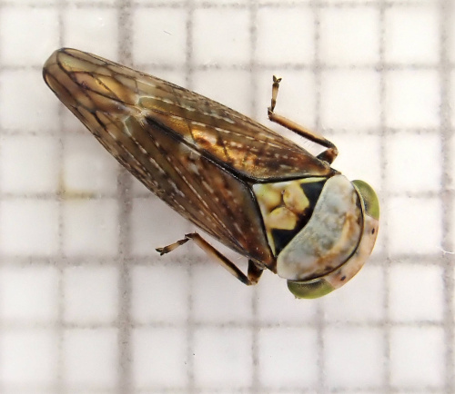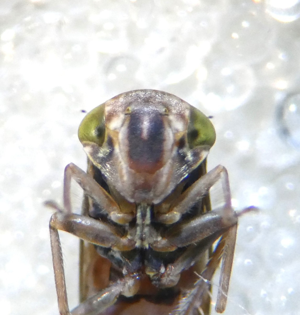 Length 5-6mm, and associated with Acer spp. esepcially Sycamore and Field Maple. Forewings marbled greyish/reddish brown, with a hyaline apical part and a light spot on the clavus.  Extremely similar to the closely-related Acericerus vittifrons - females of these species cannot be separated, males can be distinguished by the short dark bar on the face with a pale midline, which does not reach the ocelli (the minute simple eyes between the large compound eyes).