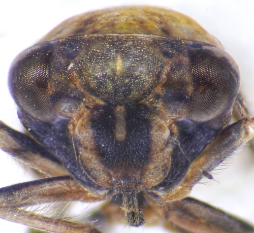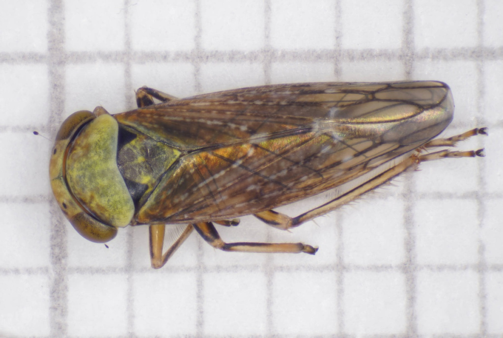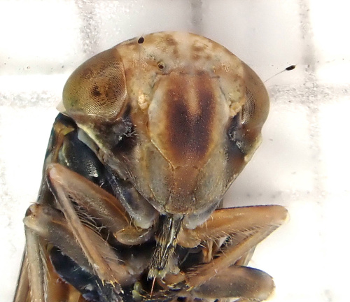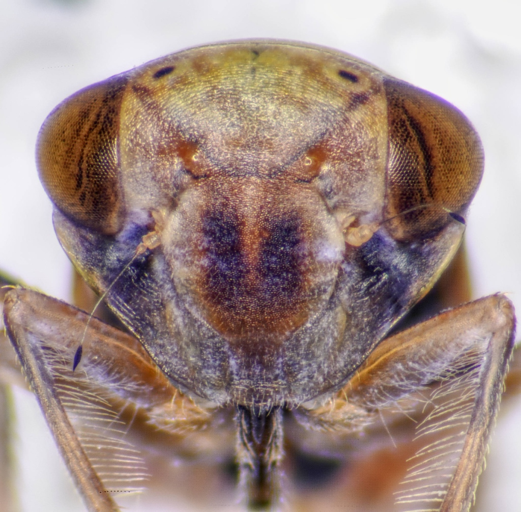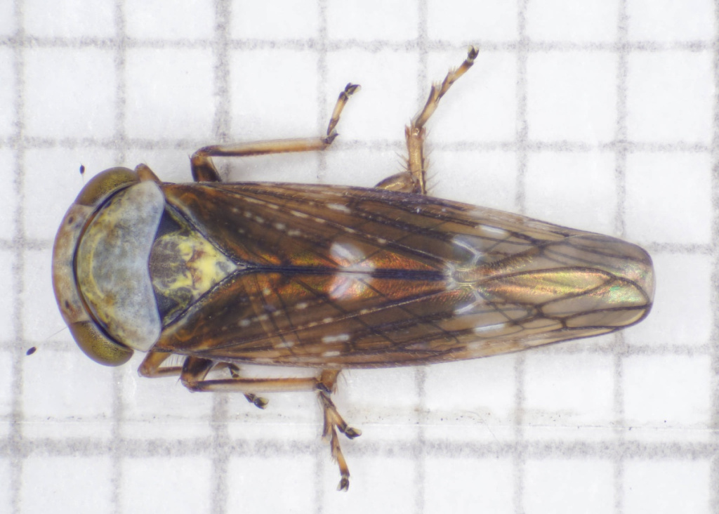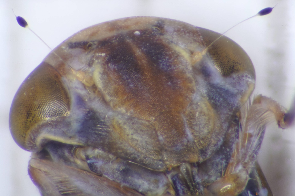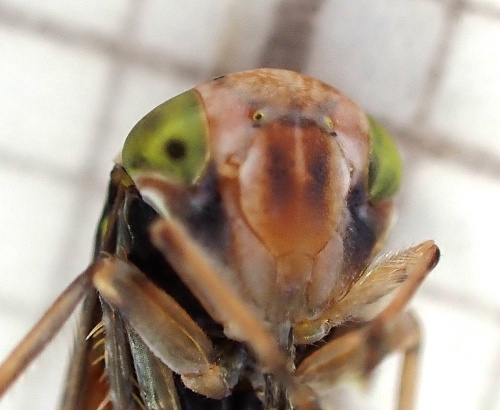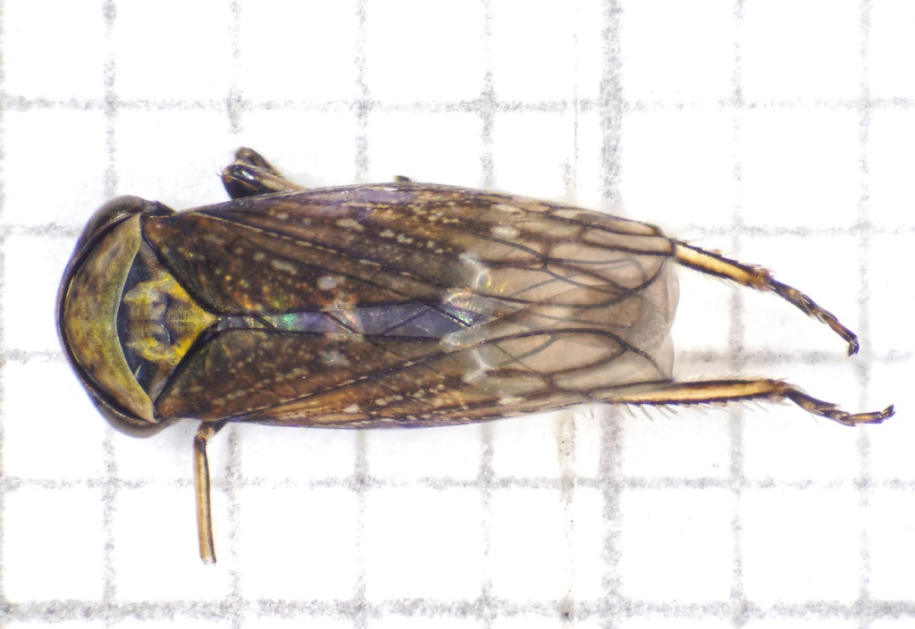 Length 5-6mm, and associated with Acer spp. esepcially Sycamore and Field Maple. Forewings marbled greyish/reddish brown, with a hyaline apical part and a light spot on the clavus.  Extremely similar to the closely-related Acericerus vittifrons - females of these species cannot be separated, males can be distinguished by the short dark bar on the face with a pale midline, which does not reach the ocelli (the minute simple eyes between the large compound eyes).