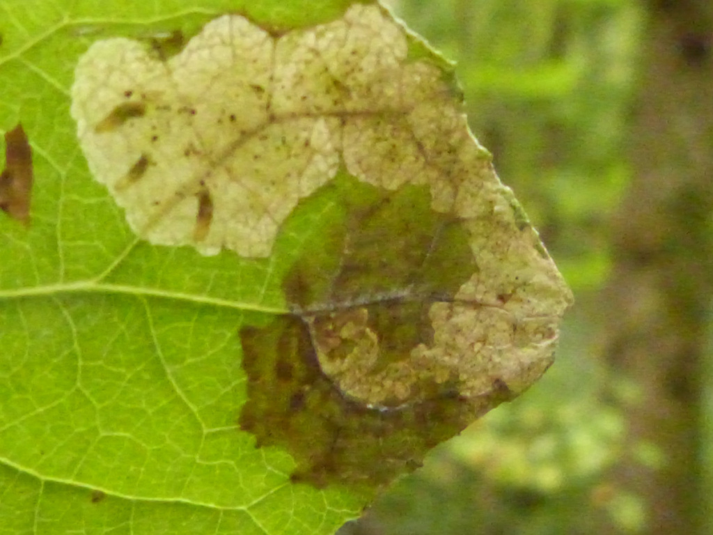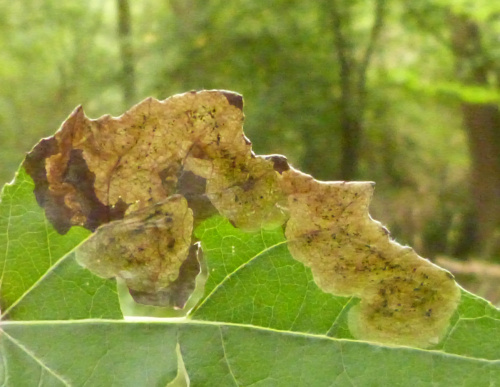 The larvae of the fly Agromyza albitarsis mine the leaves of Aspen, hybrid Black Poplar, other poplars and willows, forming a large greenish blotch mine which turns brown.