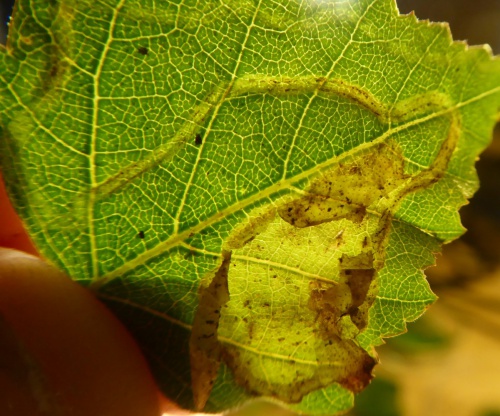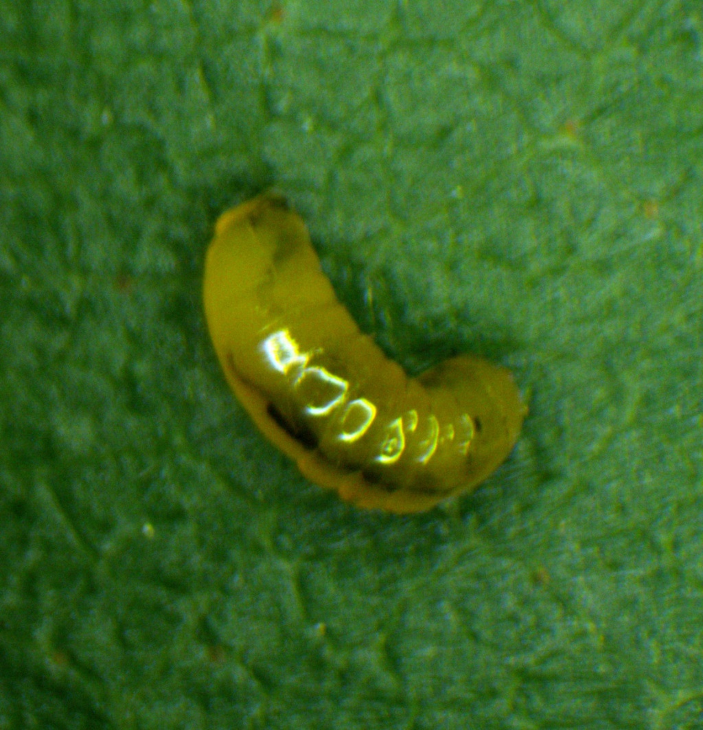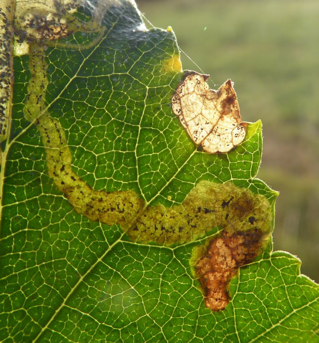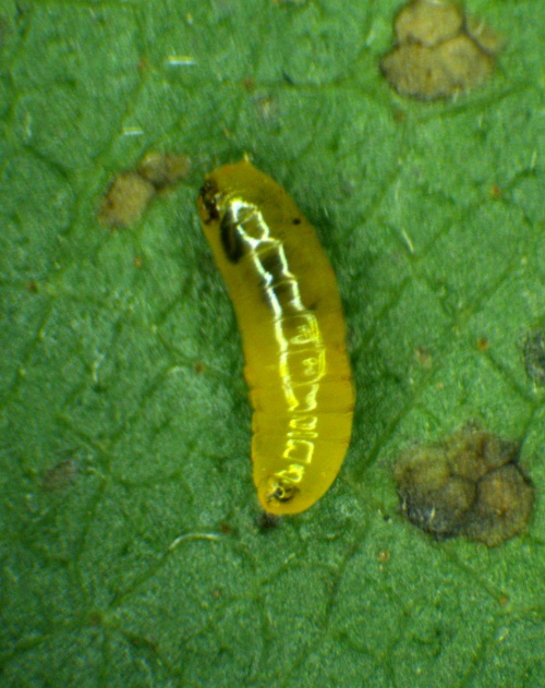 Provide backlit photographs of the whole leaf-mine in the leaf, and the larva, and note the host plant.