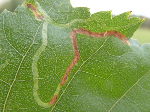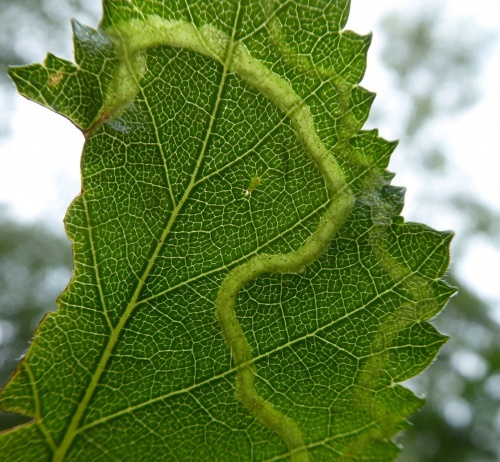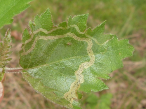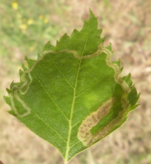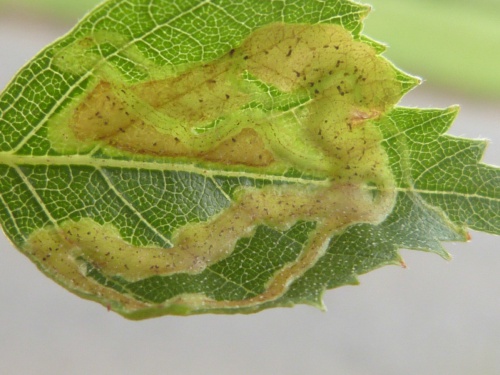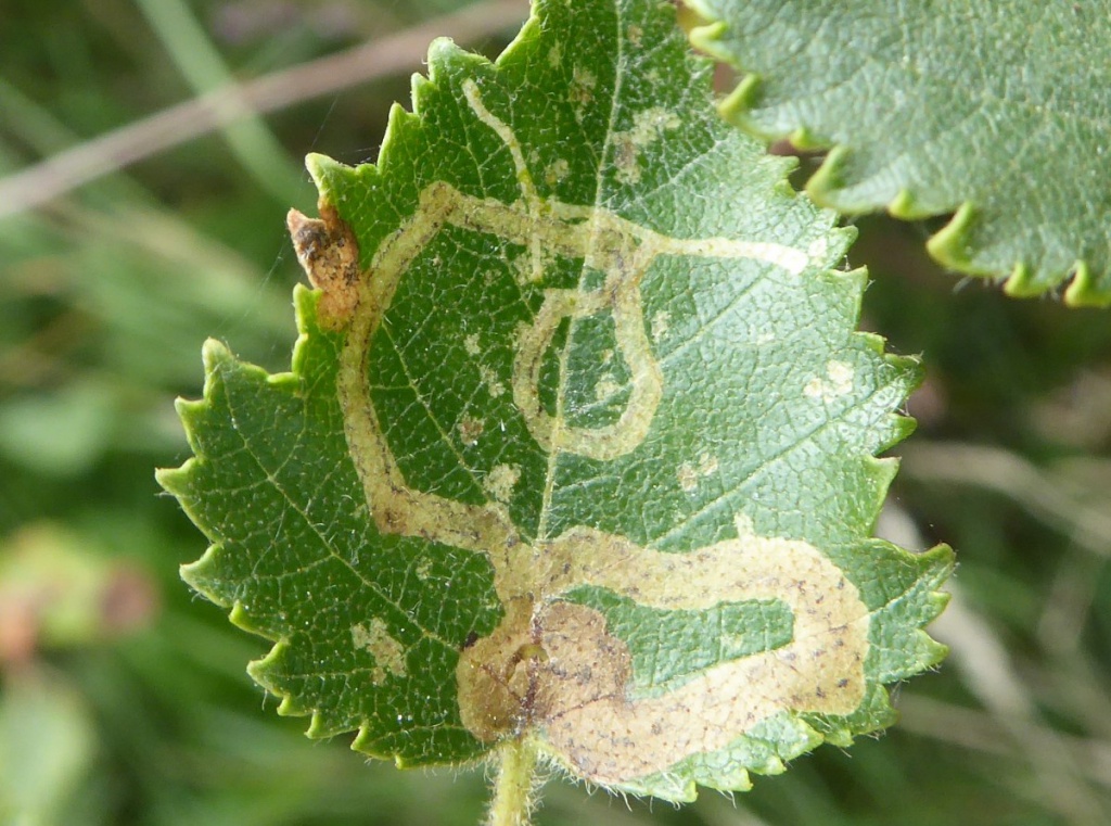 The larva produce a leaf mine in the leaves of Birch. The mine is an unusually long, upper-surface corridor that widens only little and winds freely through the leaf. Frass in two neat rows.