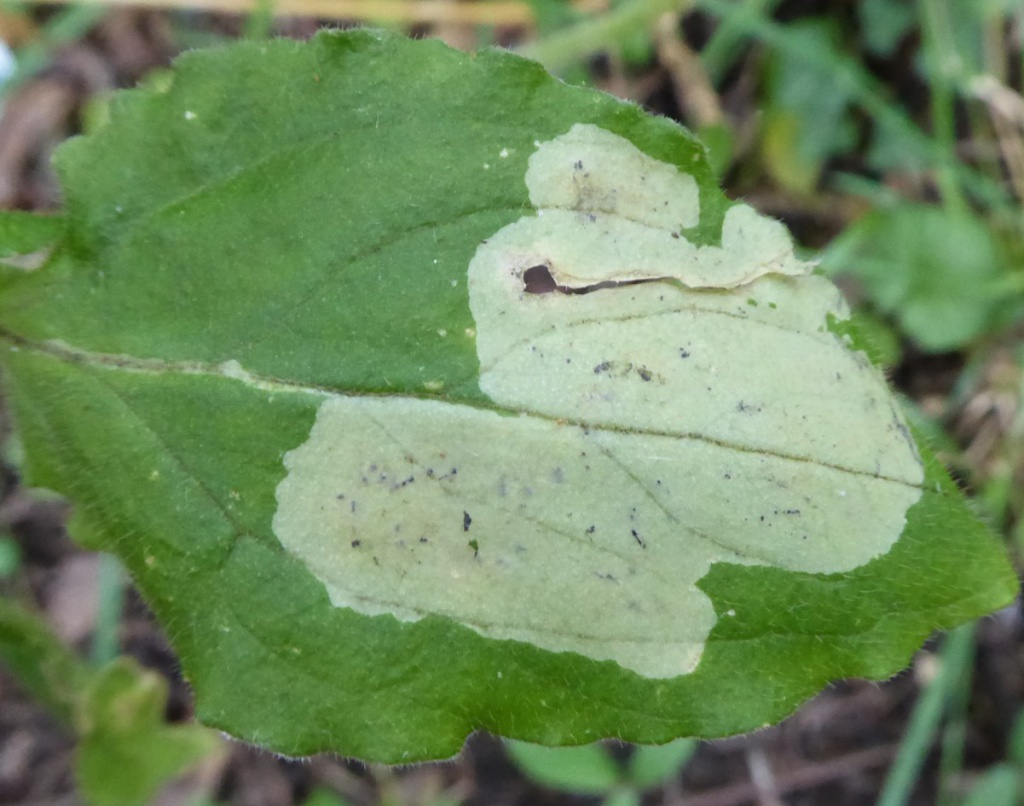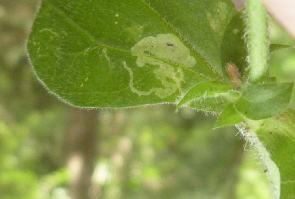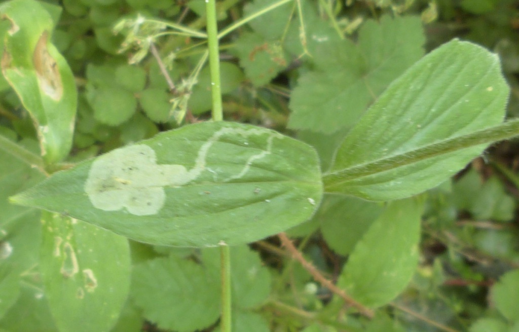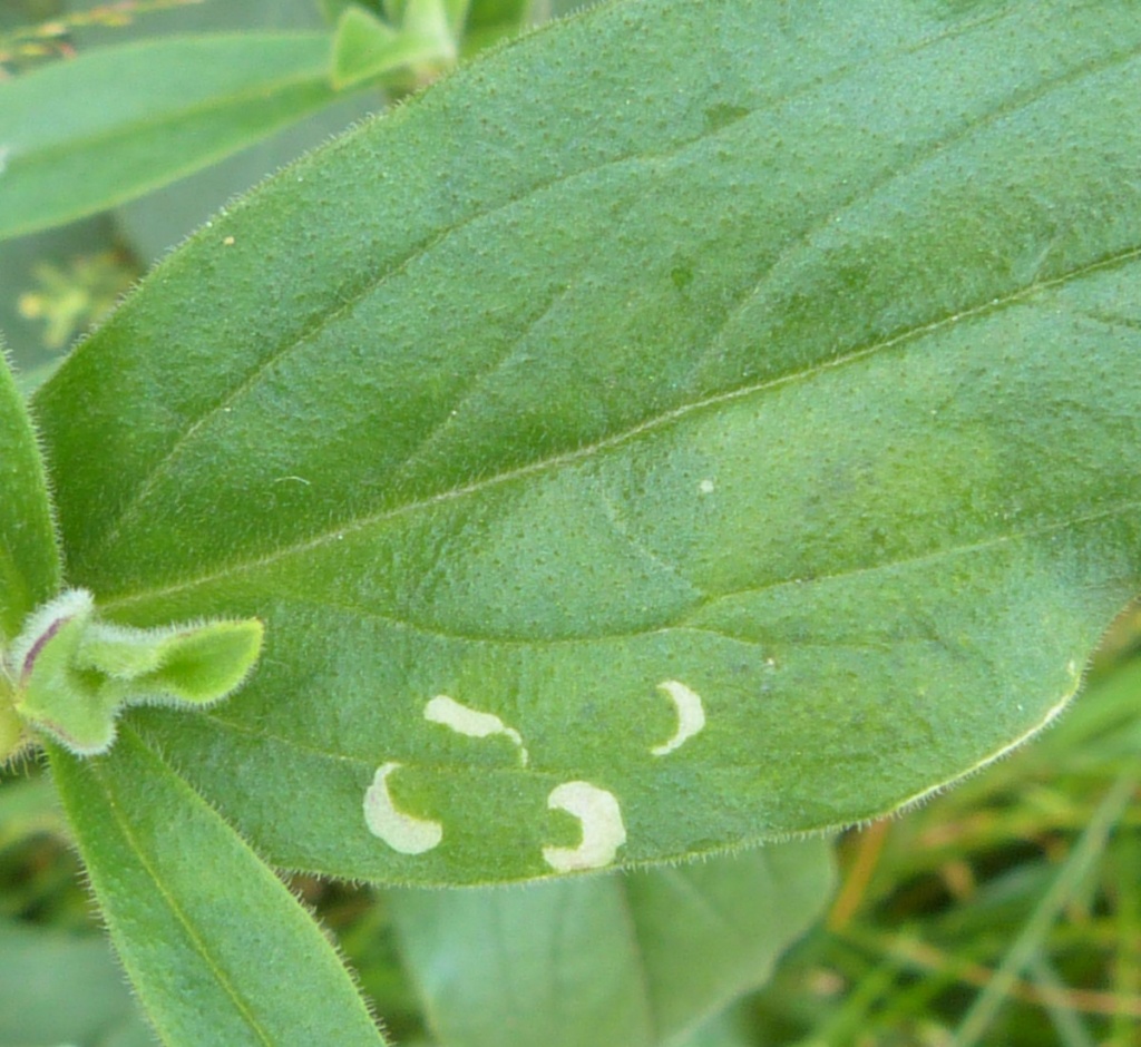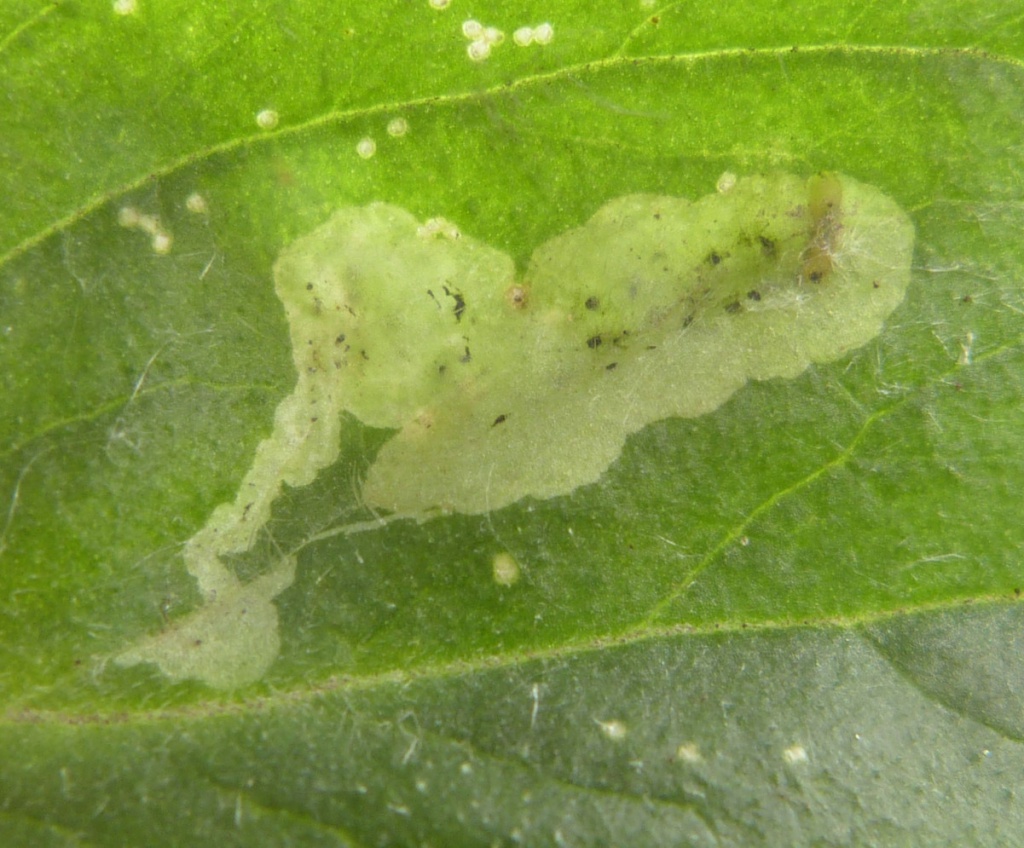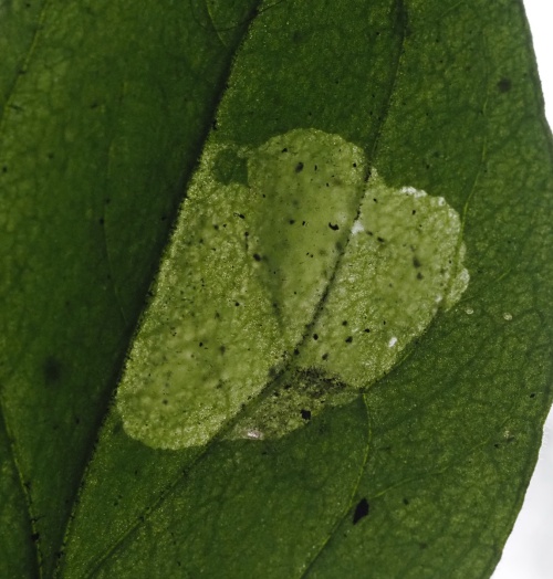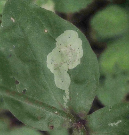 The leaf-mine formed by this species is found on the leaves of various plants including Campion. A short linear mine is formed, then a white blotch mine, the linear section sometimes is not visible under the blotch that is formed later. The blotch has a few small black grains of frass.