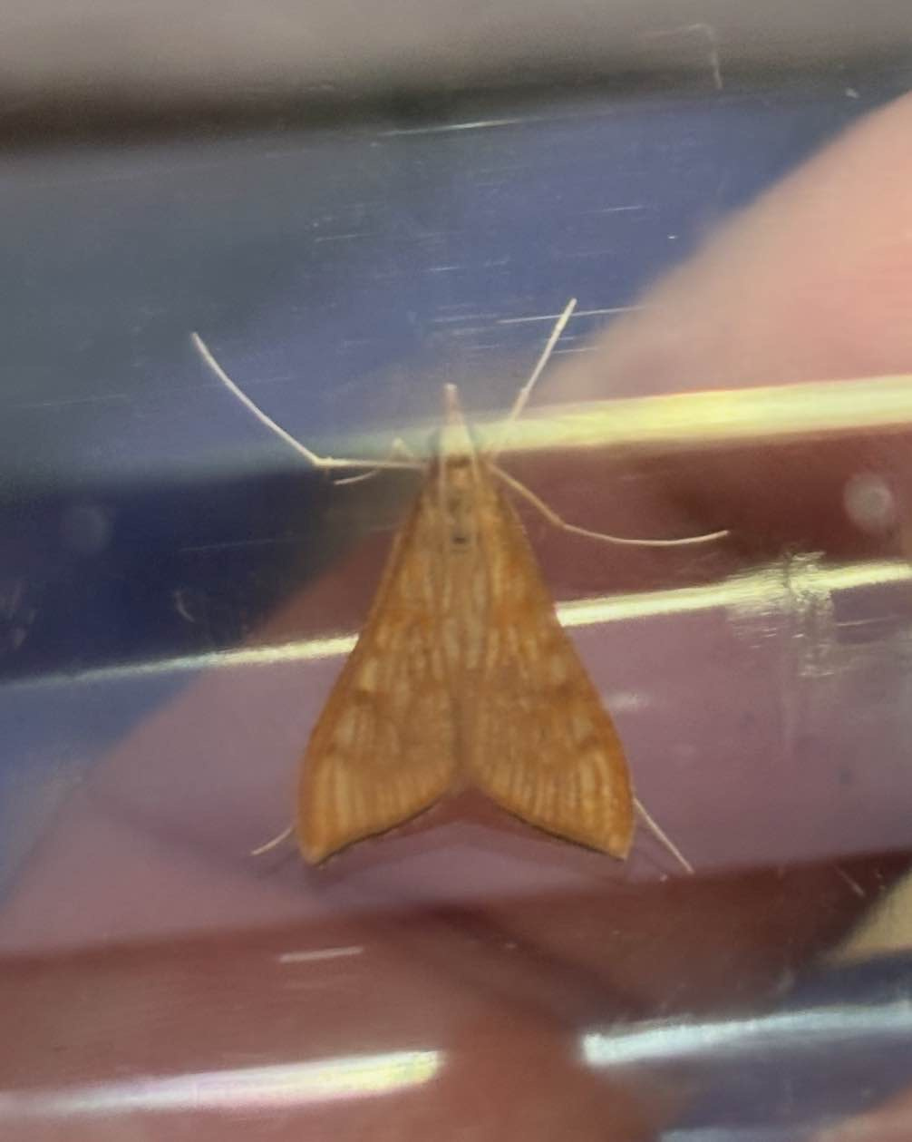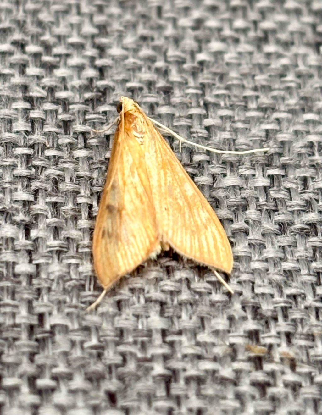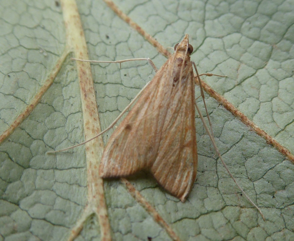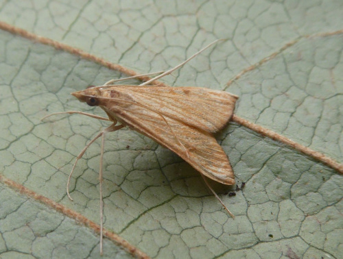 Wingspan about 20 mm. An orangey-brown and white moth that bears a superficial resemblance to Nascia cilialis, but has generally narrower forewings.