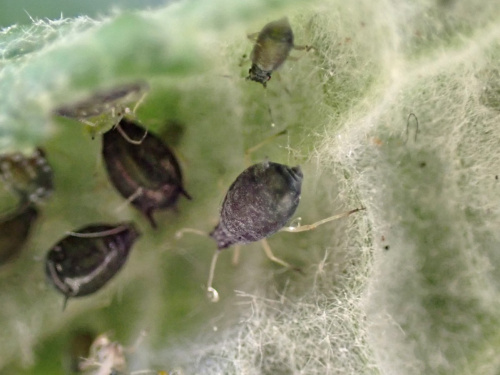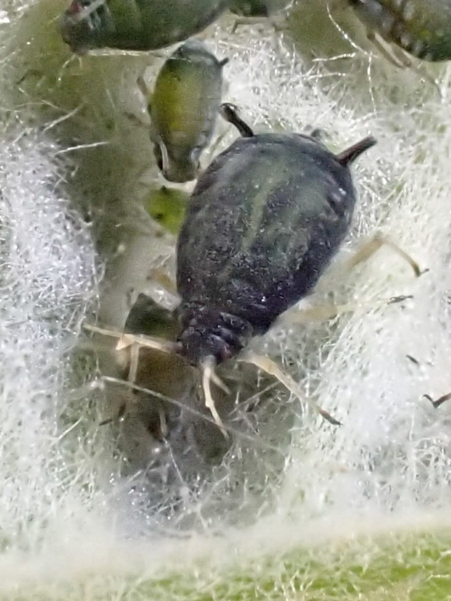 The body length of adult Aphis gossypii apterae ranges from 0.9 to 1.8 mm. Wingless females of Aphis gossypii are usually blackish green or dark green mottled with lighter. In hot conditions or when crowded they are smaller, and these dwarf forms are a very pale The cauda is variable in colour from quite pale to dusky to quite dark but it is usually paler than the siphunculi. See more information via the link below.