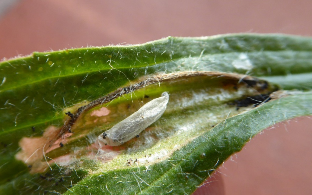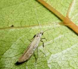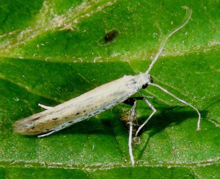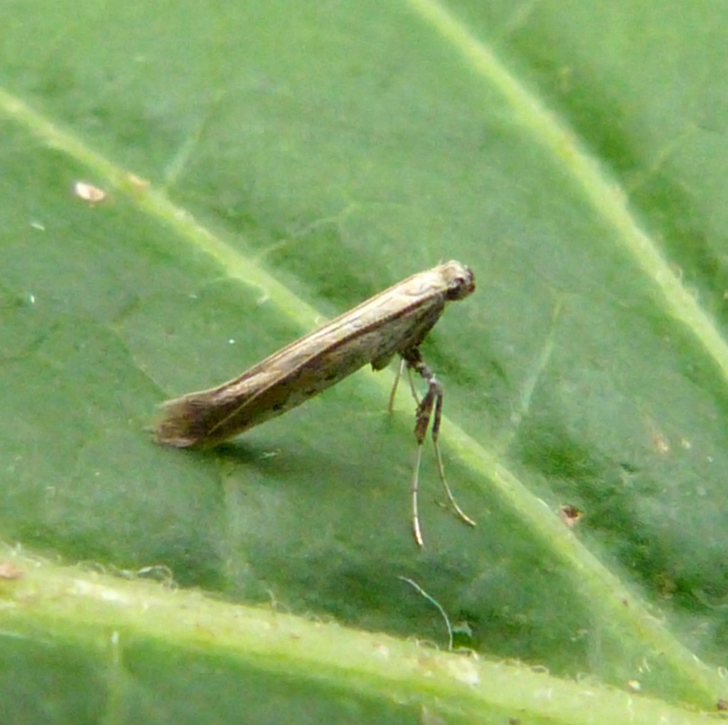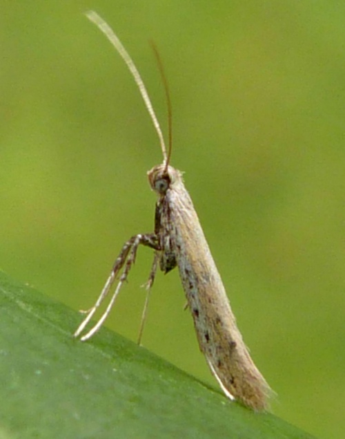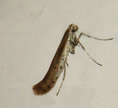 Wingspan 10-13 mm. A close relative of the genus Caloptilia, this species rests in a similar manner, with the forepart of the body raised on the front legs. The overall appearance is that the moth looks brown above fading to white below and there are rows of small dark spots. The larva mines the leaves of Ribwort Plantain, initialy in narrow gallery under the leaf, later in a blotch over the midrib on the upper side. This contracts, puckering the leaf and causing it to fold up. Pu[paton is in a coccon in the mine.