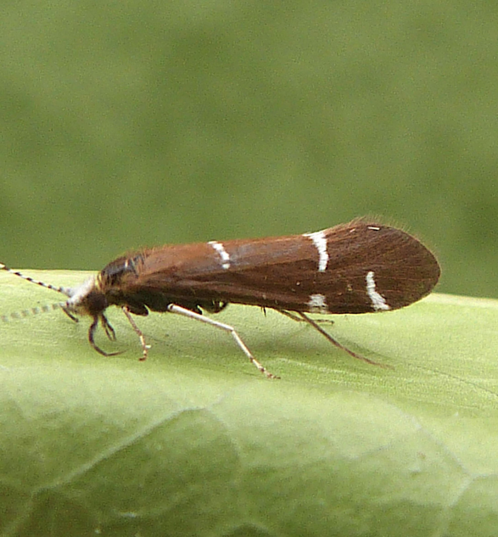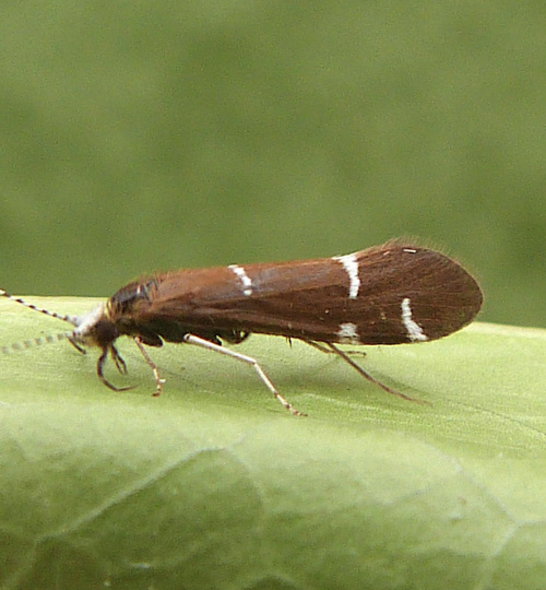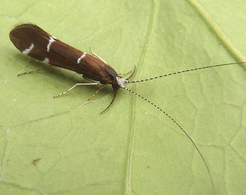 This caddis has a forewing length of 7 to 9 mm. The wings are dark brown with four white markings and the top of the head is white. There is a form interjectus which has black wings.