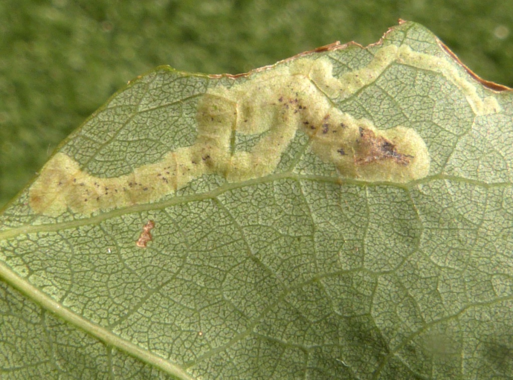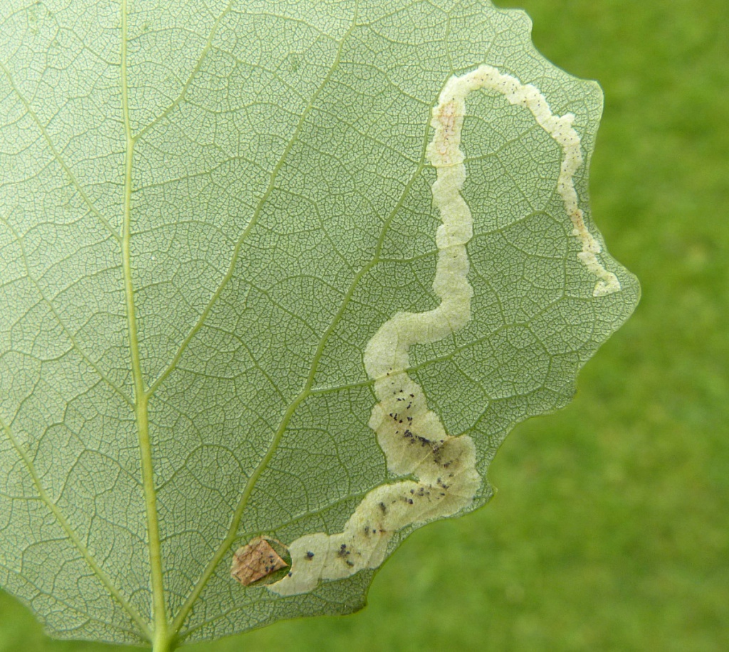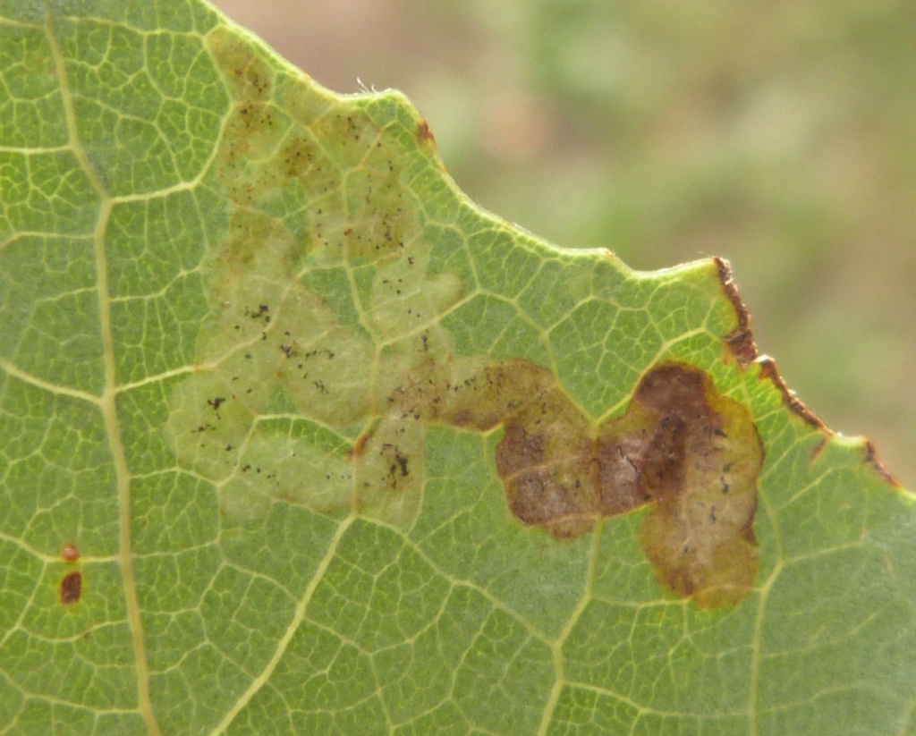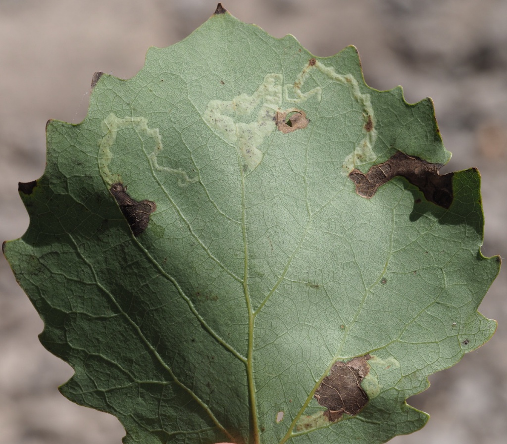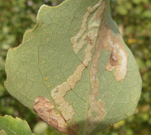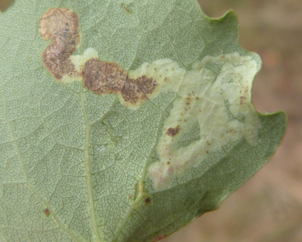 The larvae of the fly Aulagromyza tremulae mine the leaves of Aspen (and possibly Black Poplar). The mine is a long winding gallery on the underside of the leaf.