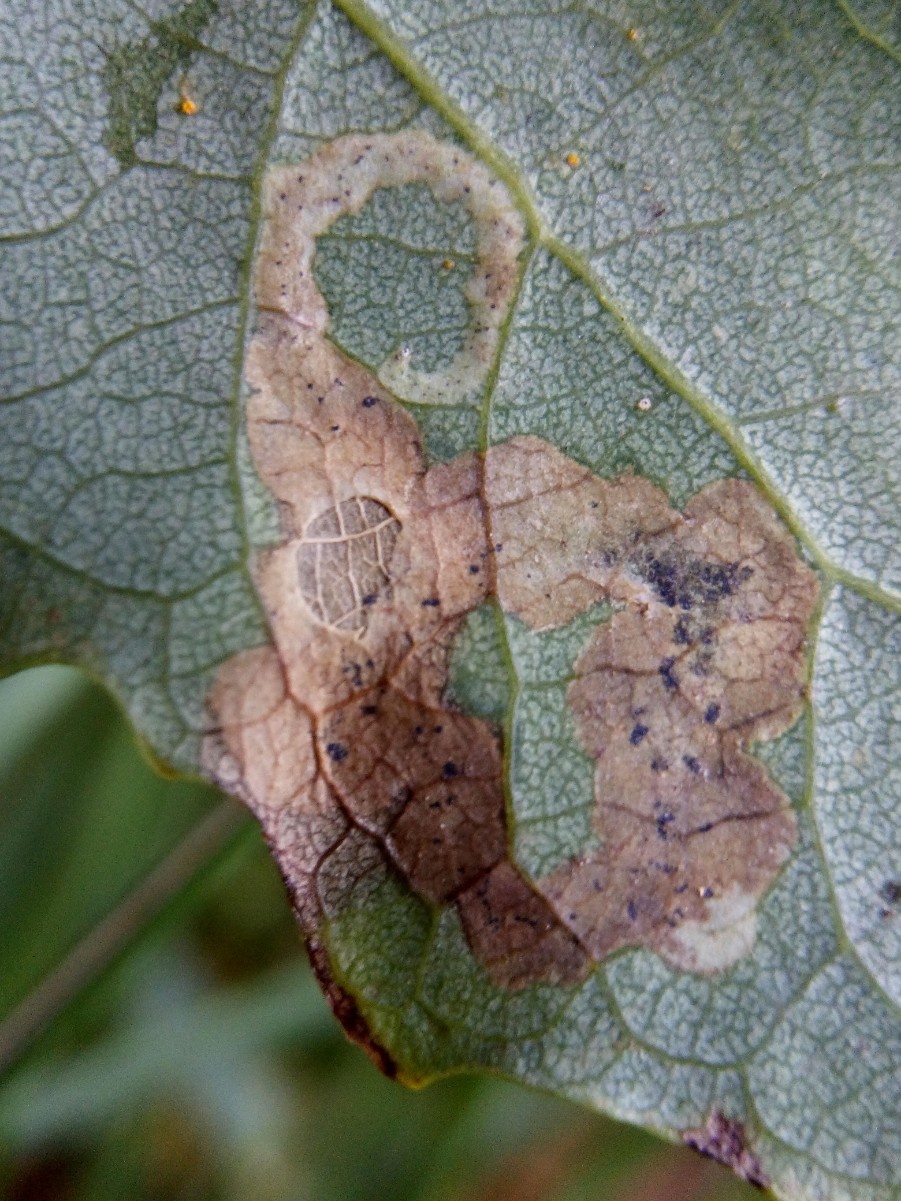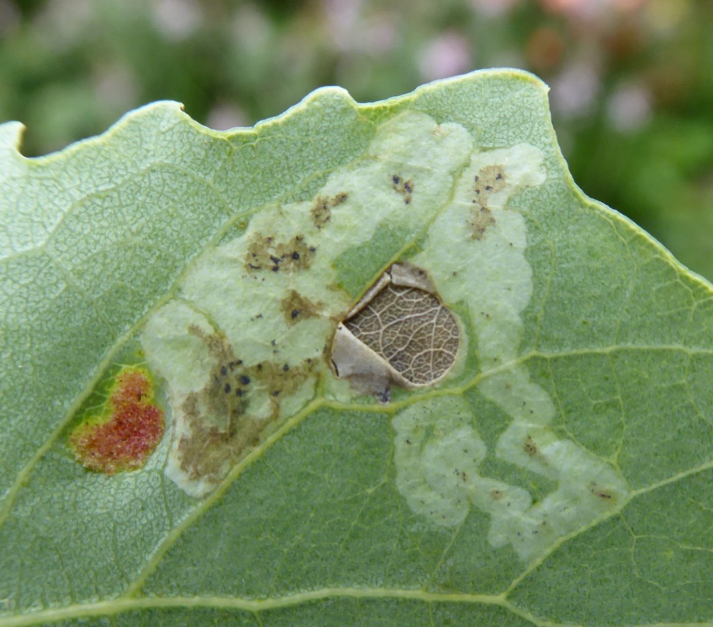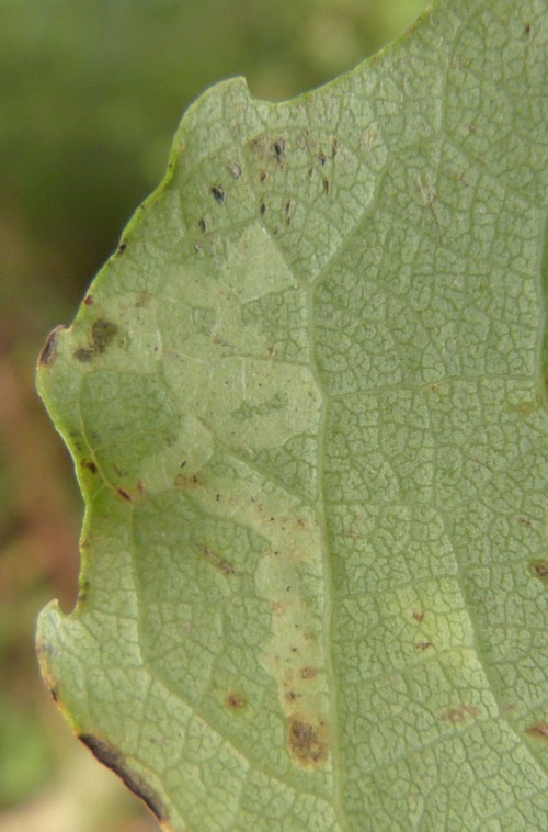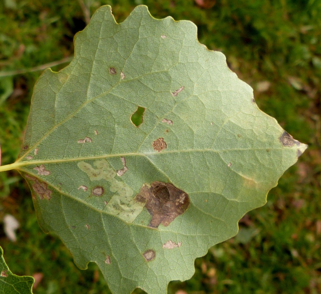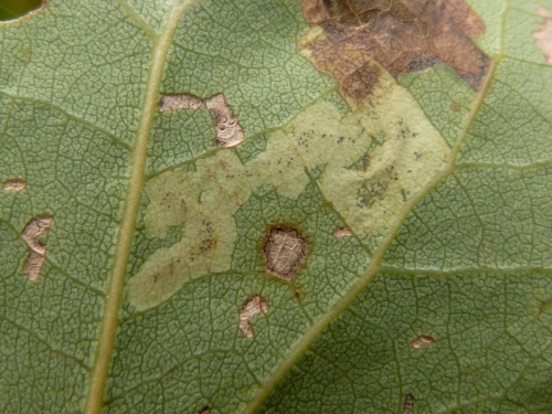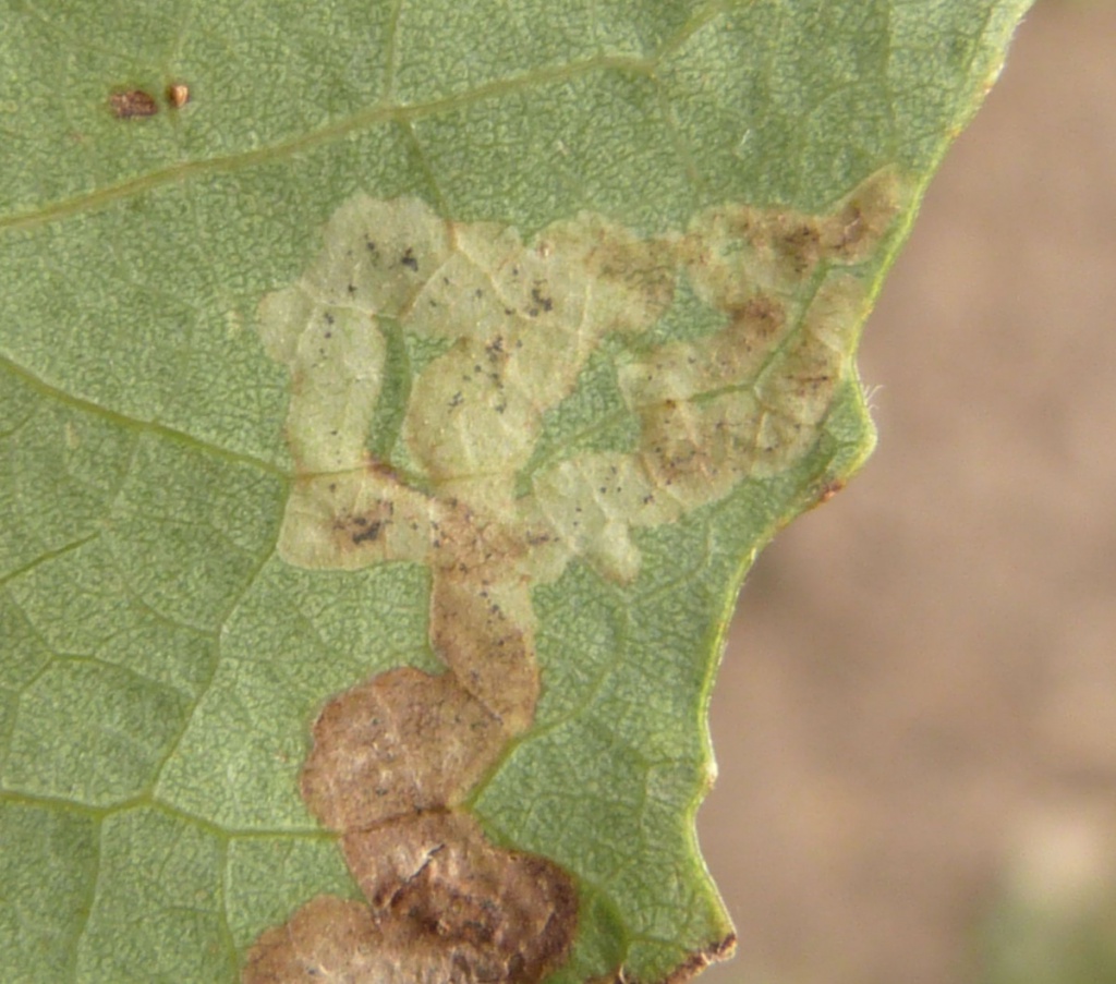 The larvae of the fly Aulagromyza tremulae mine the leaves of Aspen (and possibly Black Poplar). The mine is a long winding gallery on the underside of the leaf.
