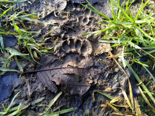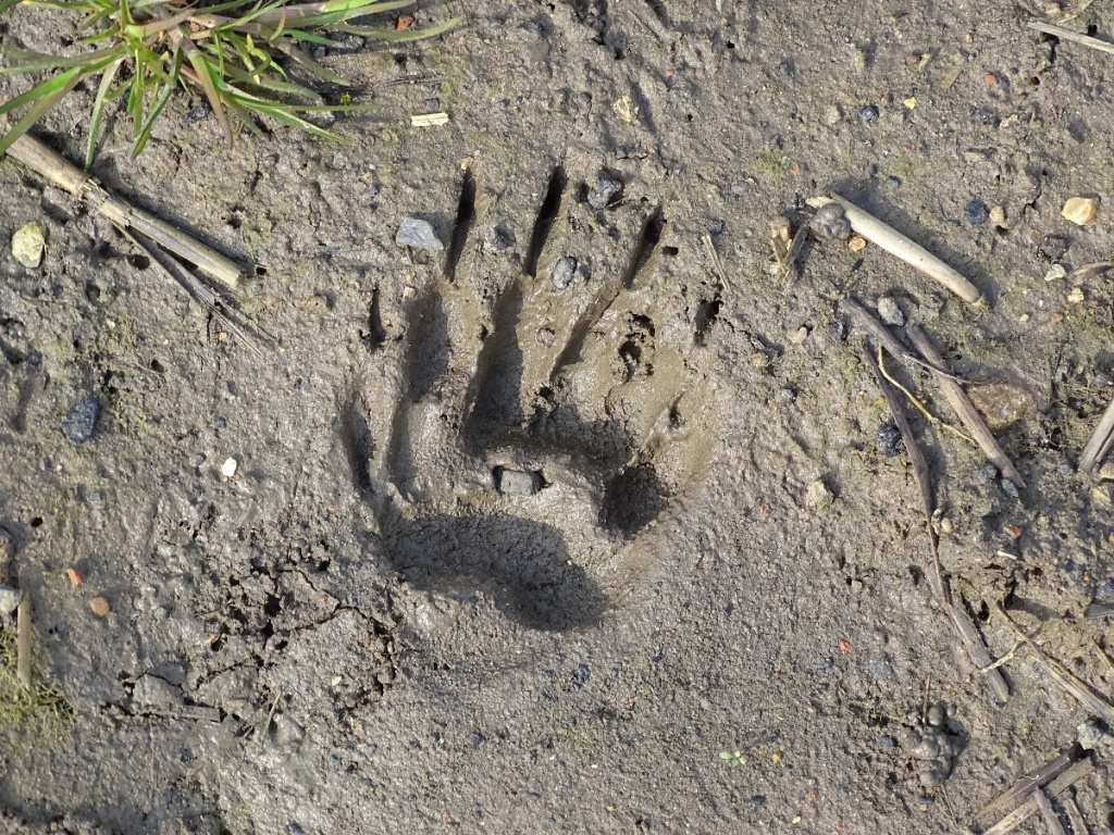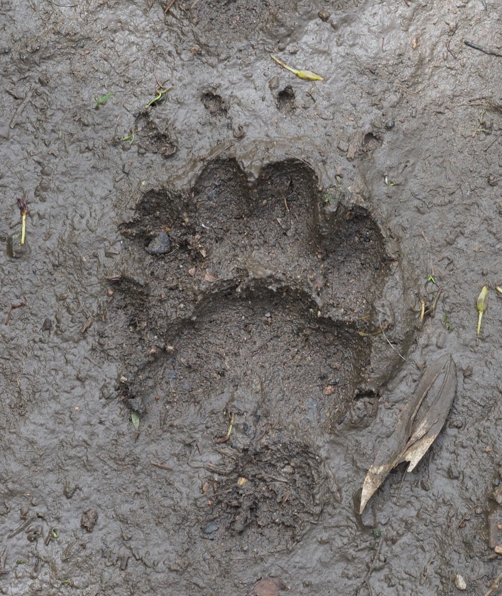 Paw prints - 5 toes but thumb usually not visible, large central pad and four toes general in alignment and one or more claws present in soft ground.