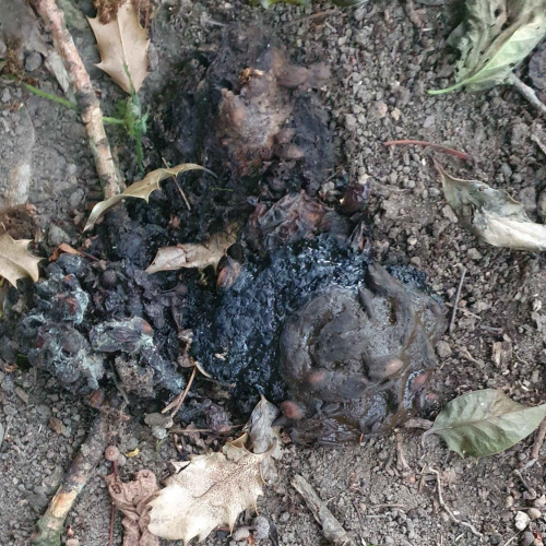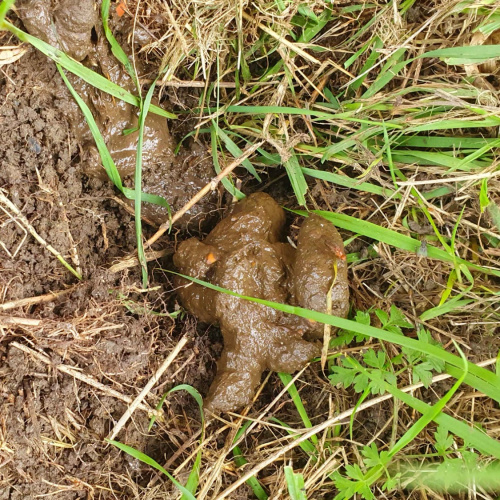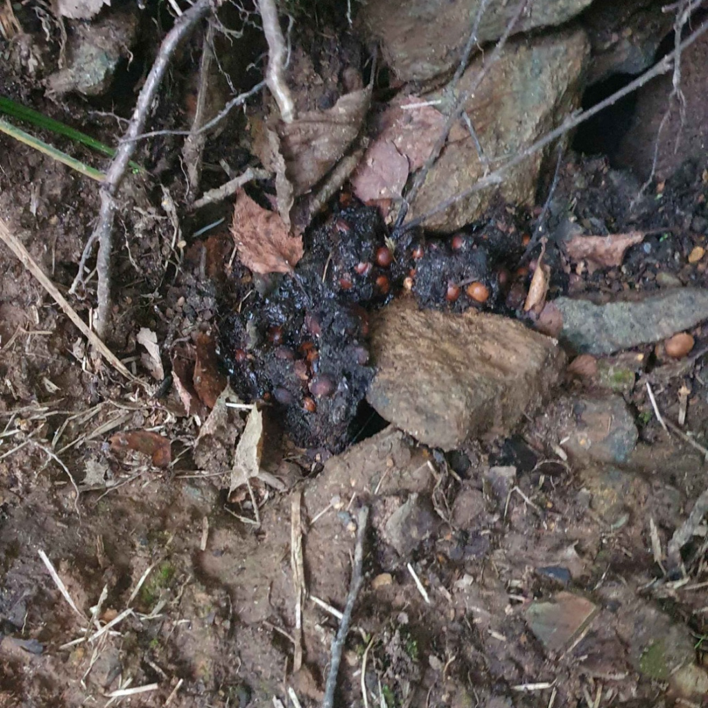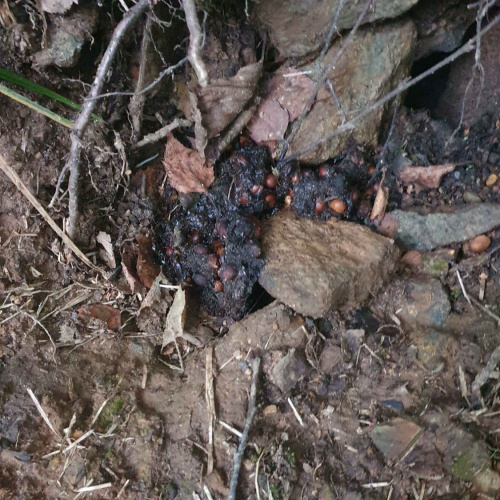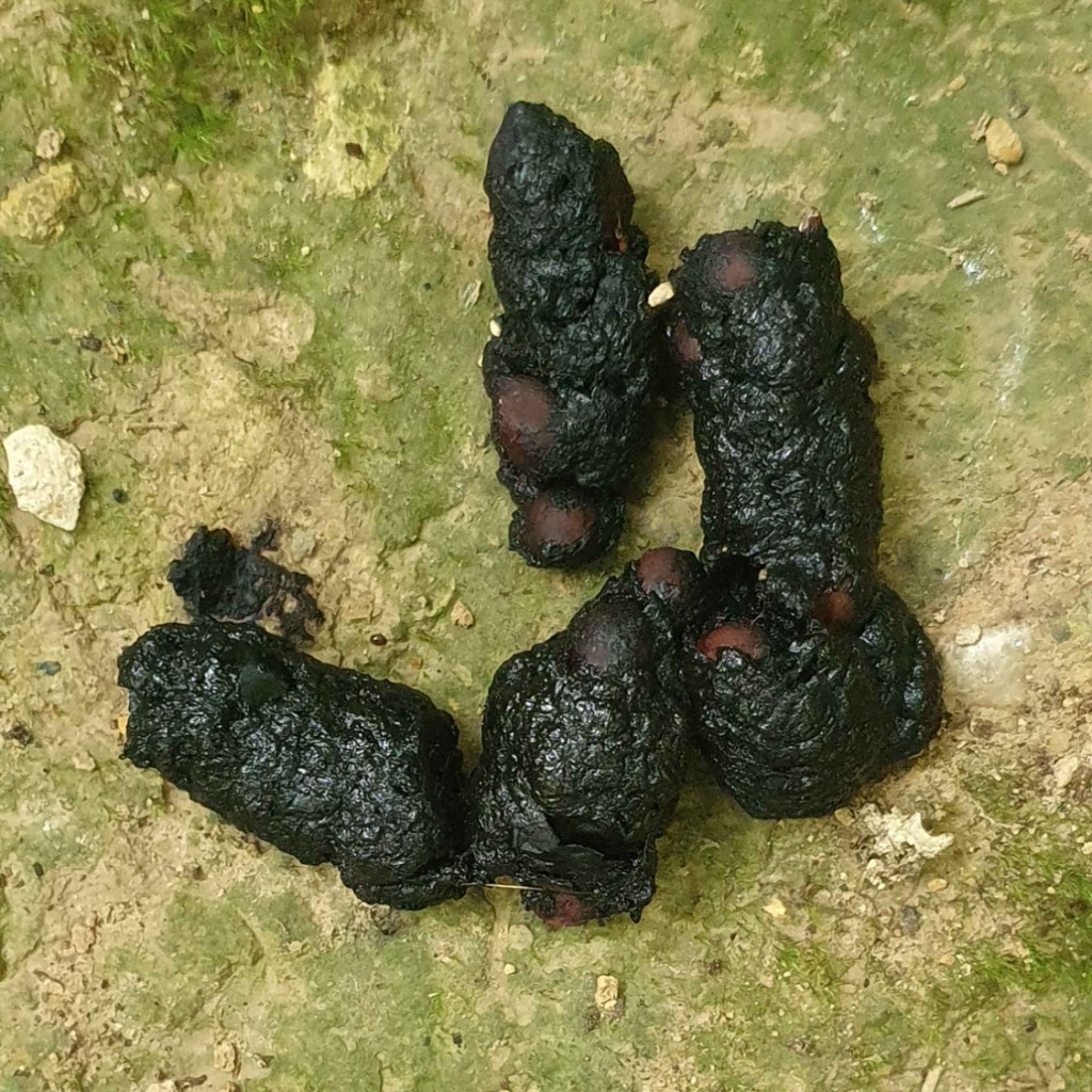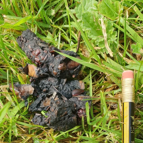 Latrine - found in one or more shallow depressions and can be quite extensive when used to mark their territory. Consistency and colour of faeces will vary with diet