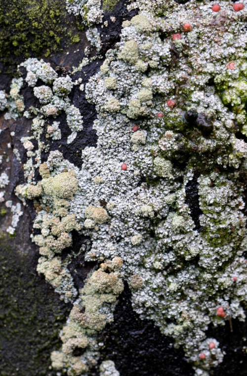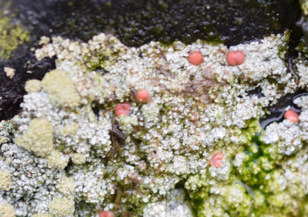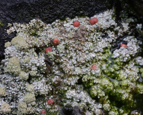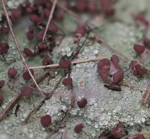 Baeomyces rufus is characterized by bulbous apothecia which may vary from reddish brown to orange to pink, and which become translucent when wet; they may reach a maximum diameter of 2 mm, on top of stalks no taller than 6 mm. The thallus may be green, grey or greenish-grey, and may have a brownish tinge. Unlike other Baeomyces species, Baeomyces rufus? margins are unlobed.