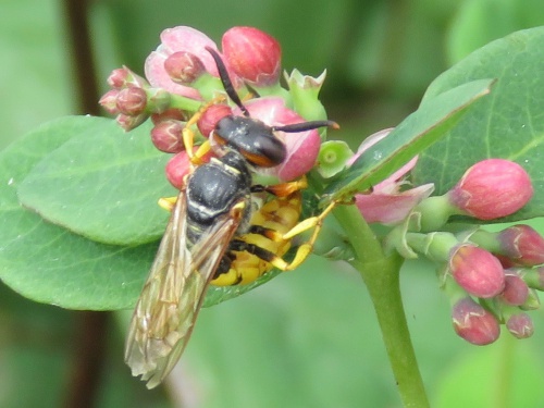 The Bee Wolf is one of the largest (up to 17 mm) and most spectacular solitary wasp species in Britain. It can be distinguished by the unfolded wings and thickened antennae. The abdomen and face are extensively yellow and the back of the head behind the eyes is reddish-brown. The wing venation will confirm identification.