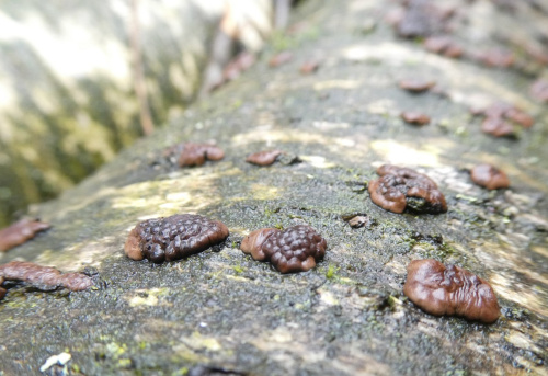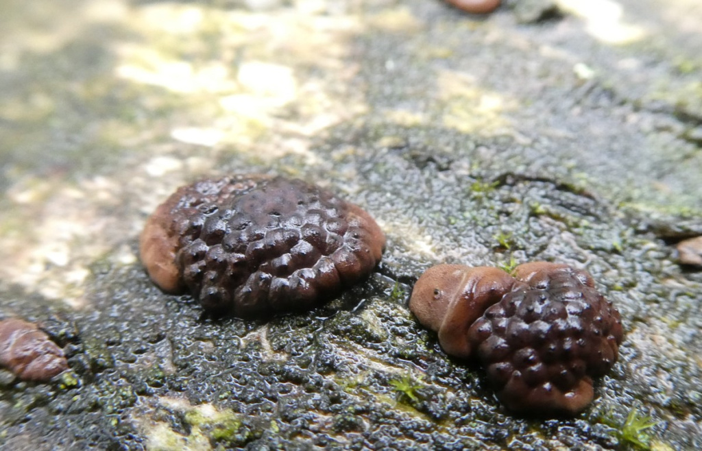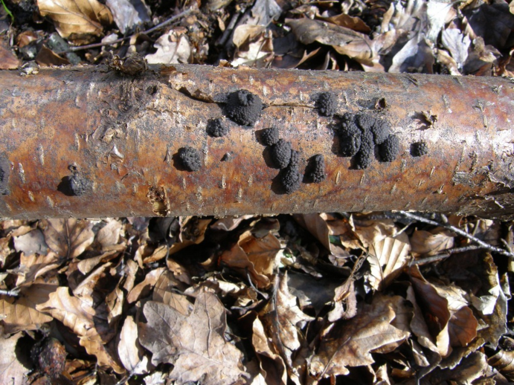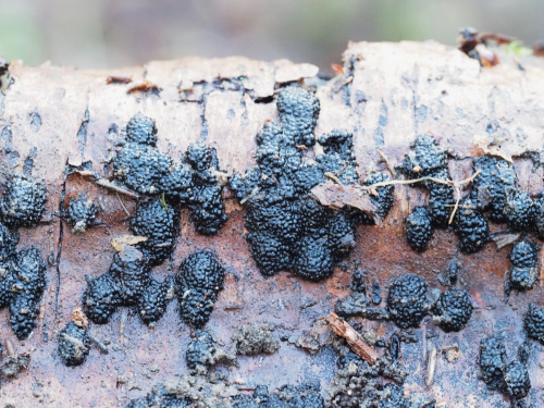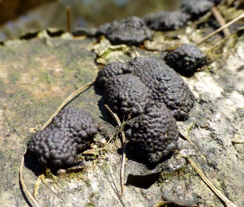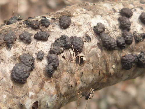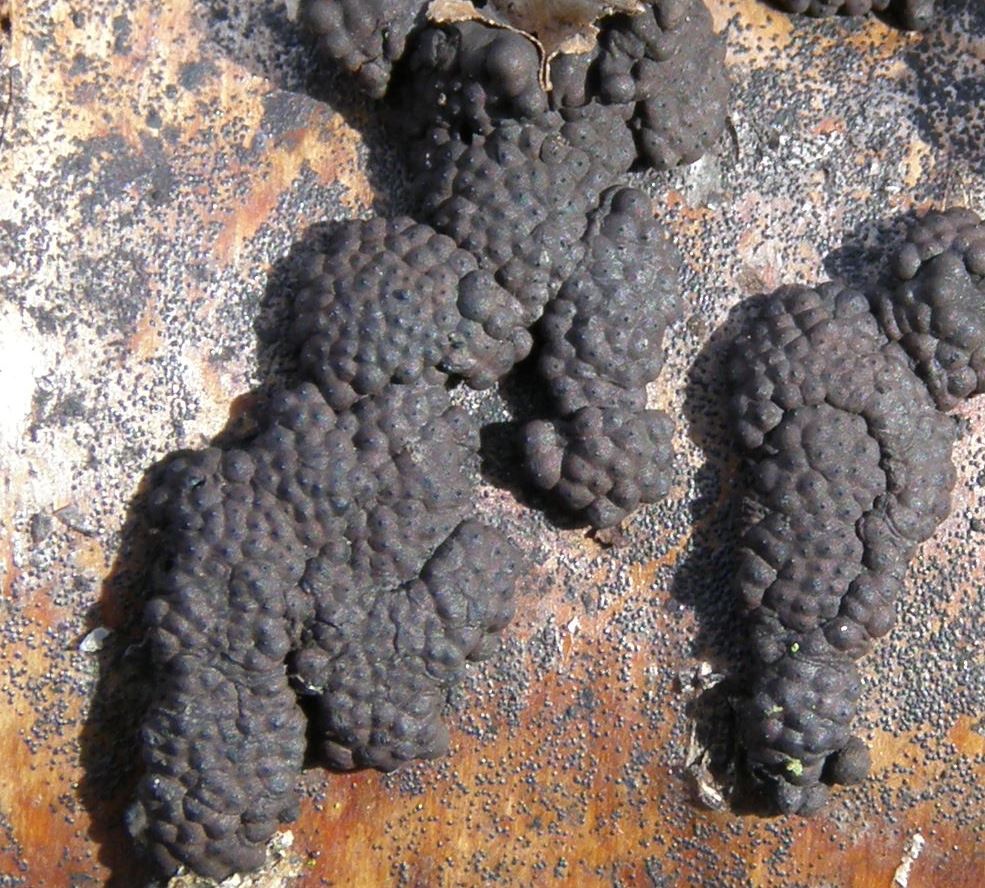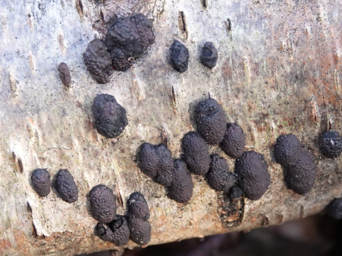 Hard cushion shaped stroma growing out of the bark of trees, usually birch. Each has a bumpy, knobbly surface formed by the raised ostioles through which the spore are eventually ejected. The ostioles are papillate - they have a small nipple-like projection in the centre. The stroma are intially reddish-brown, becoming dark brown or black. Often coalescing to form a larger mass.