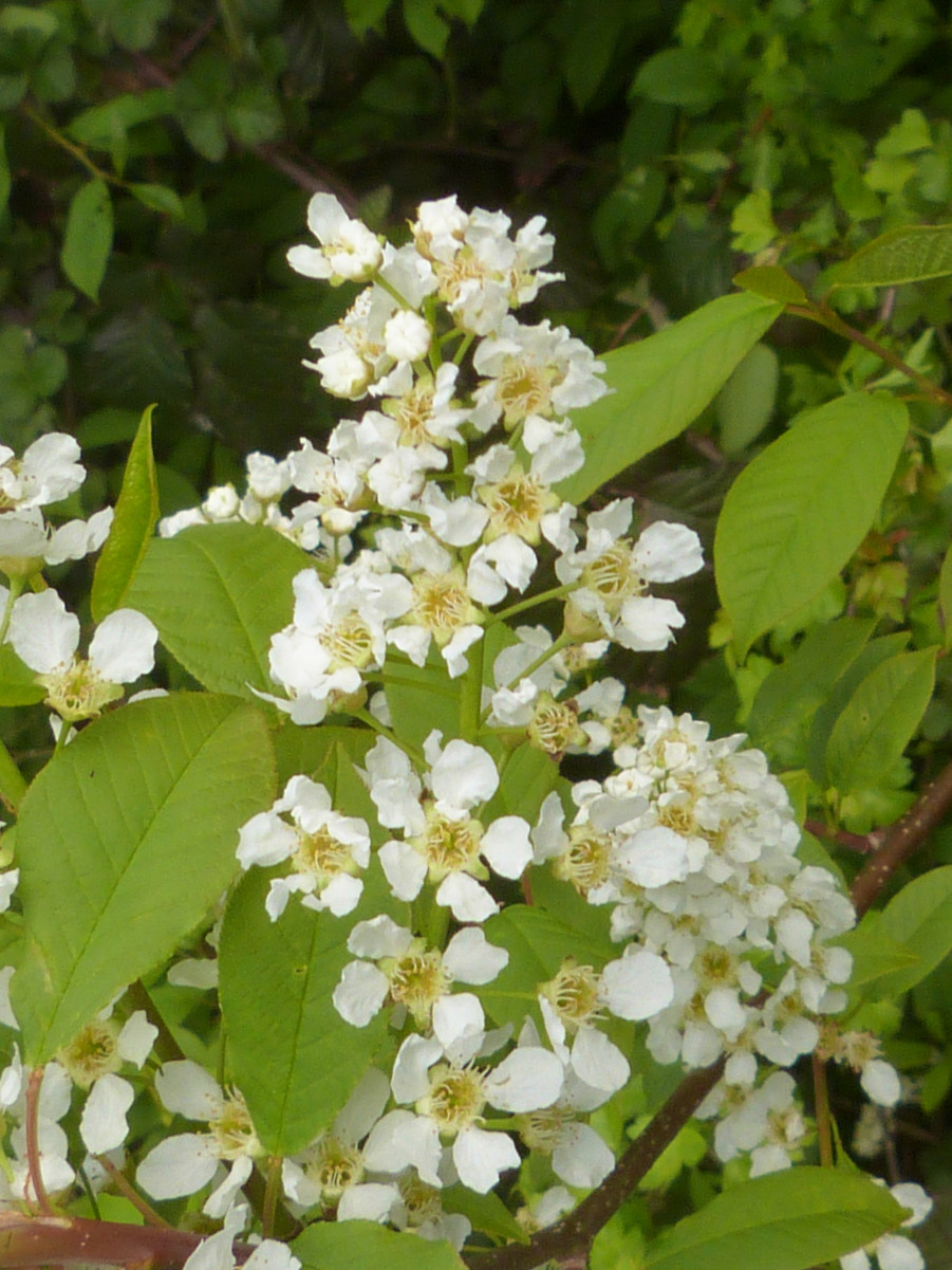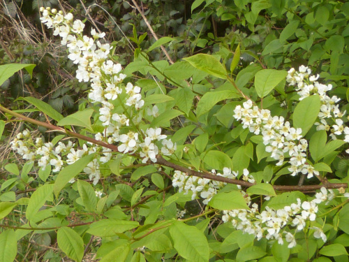Tree or shrub to 17 metres, bark foetid, brown and peeling. Leaves elliptical, pointed and toothed. Flowers white, 10 to 16 mm, in long slender pendent racemes, heavily scented. Fruit small, shiny, black 6 to 8 mm, globose and bitter tasting.