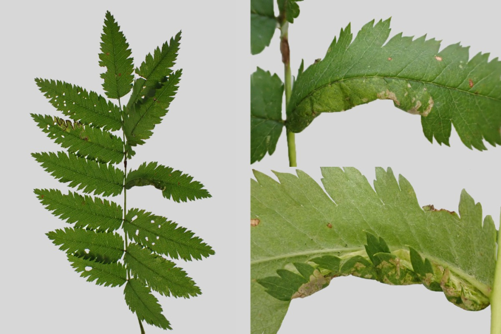 The larva of the moth Phyllonorycter sorbi mines the leaves of Rowan or Bird Cherry, and occasionally on Whitebeam or other hosts in the Rosaceae, creating a long tentiform mine along the midrib/eaf-edge on Rowan. The under-surface has several sharp folds. The pupa inside is in a strong white cocoon. The mature larva is yellow with a pale brown head.