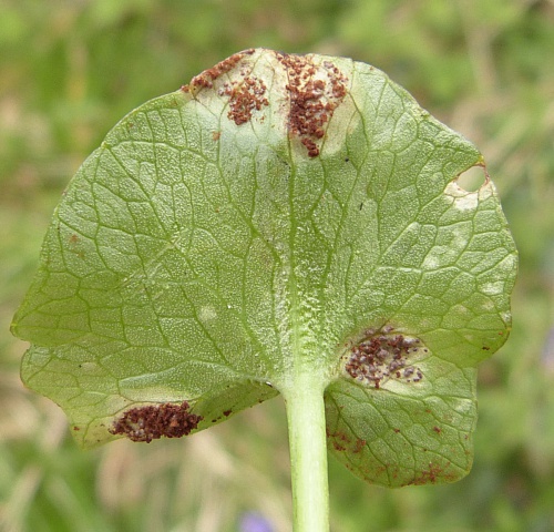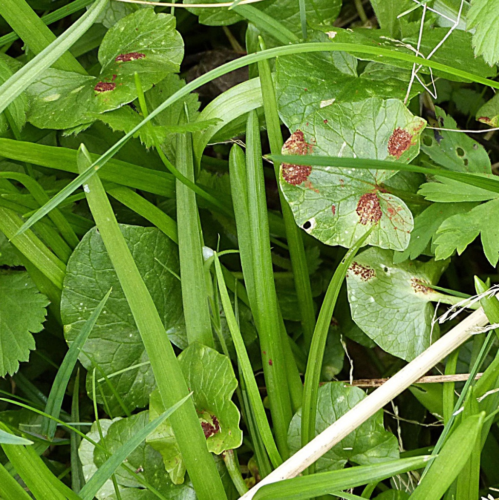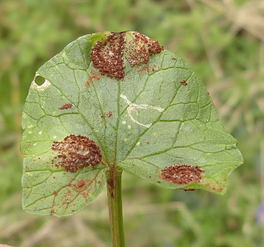 Bitter Chocolate Rust (Uromyces ficaria) is a rust fungus affecting Lesser Celandine (Ficaria verna). There is no host plant alternation and only the chocolate-brown telia are present on raised swollen areas of leaves and petioles, causing galls.