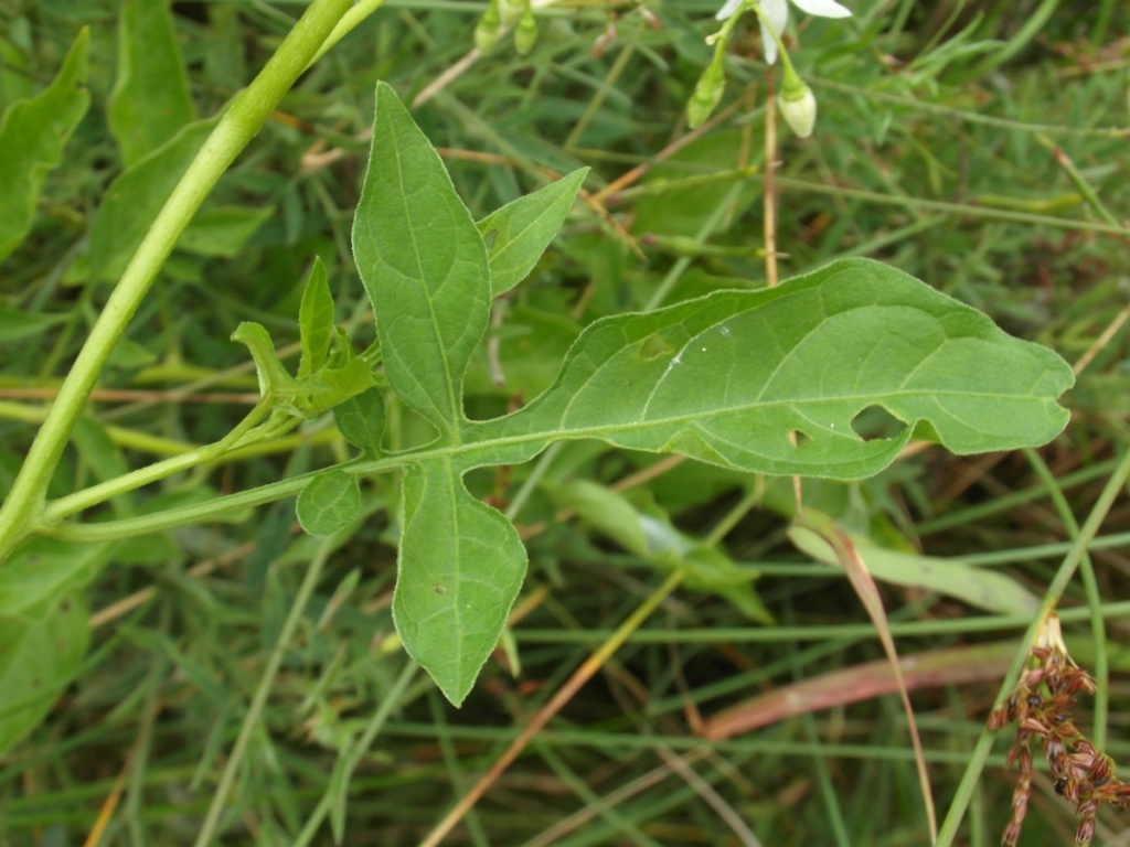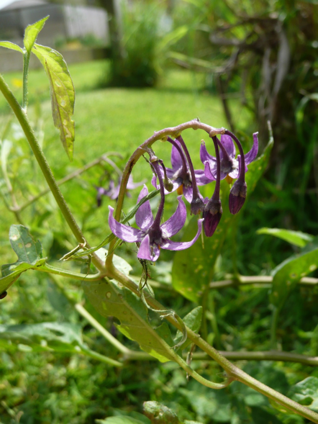 Scrambling plant with stems sometimes reaching 2 metres. Leaves arrow shaped or heart shaped. Flowers purple with pale yellow anthers (very rarely white), 10 to 15 mm nodding with reflexed petals. Berry egg shaped, shiny and red when ripe.