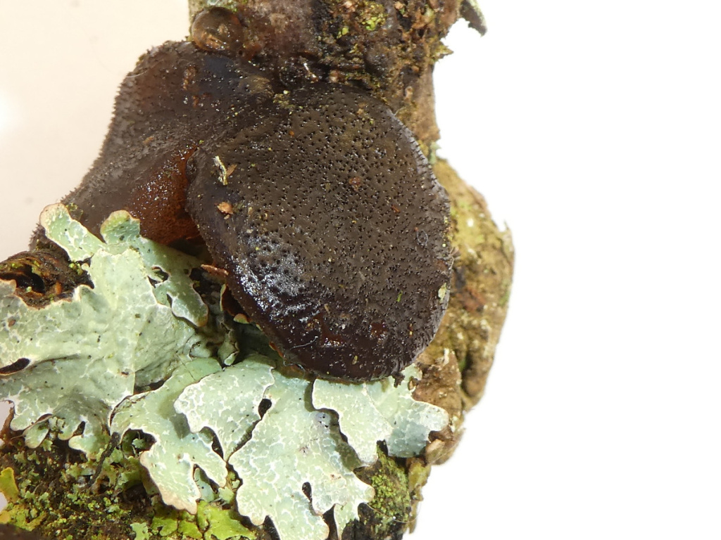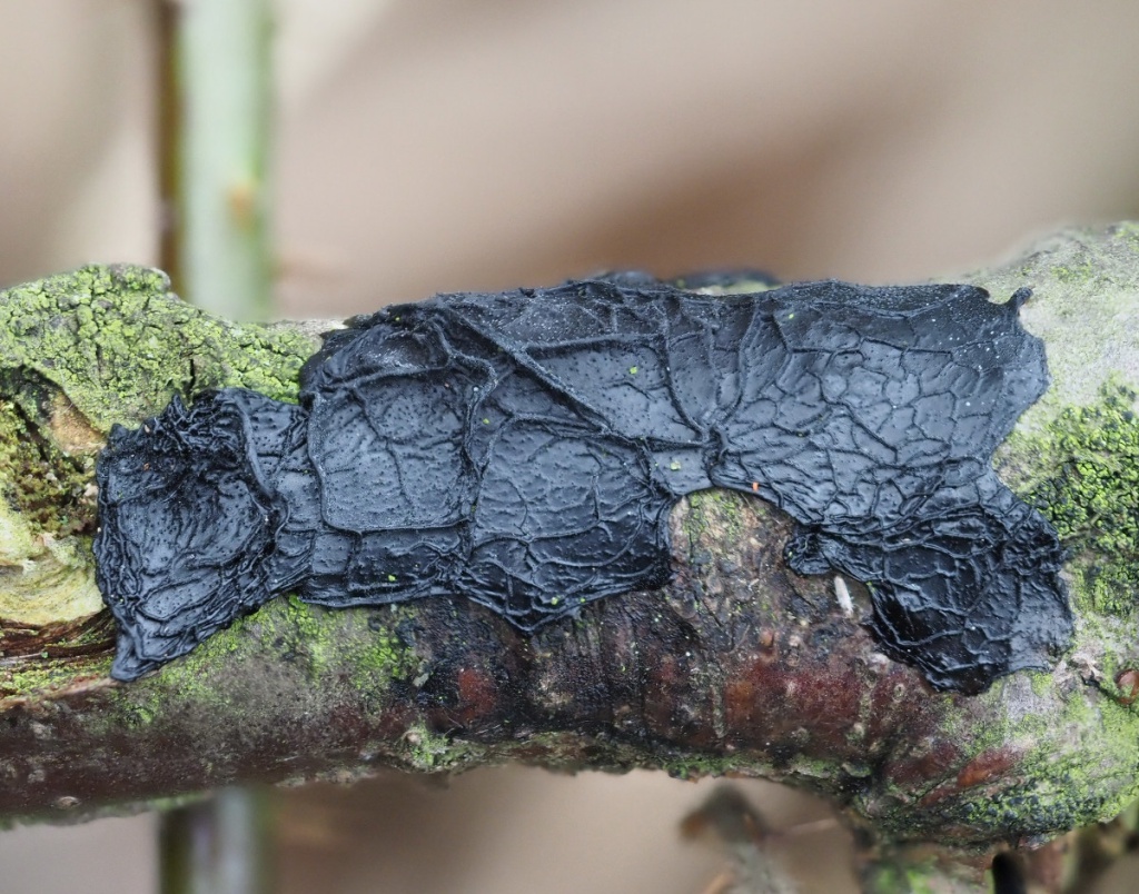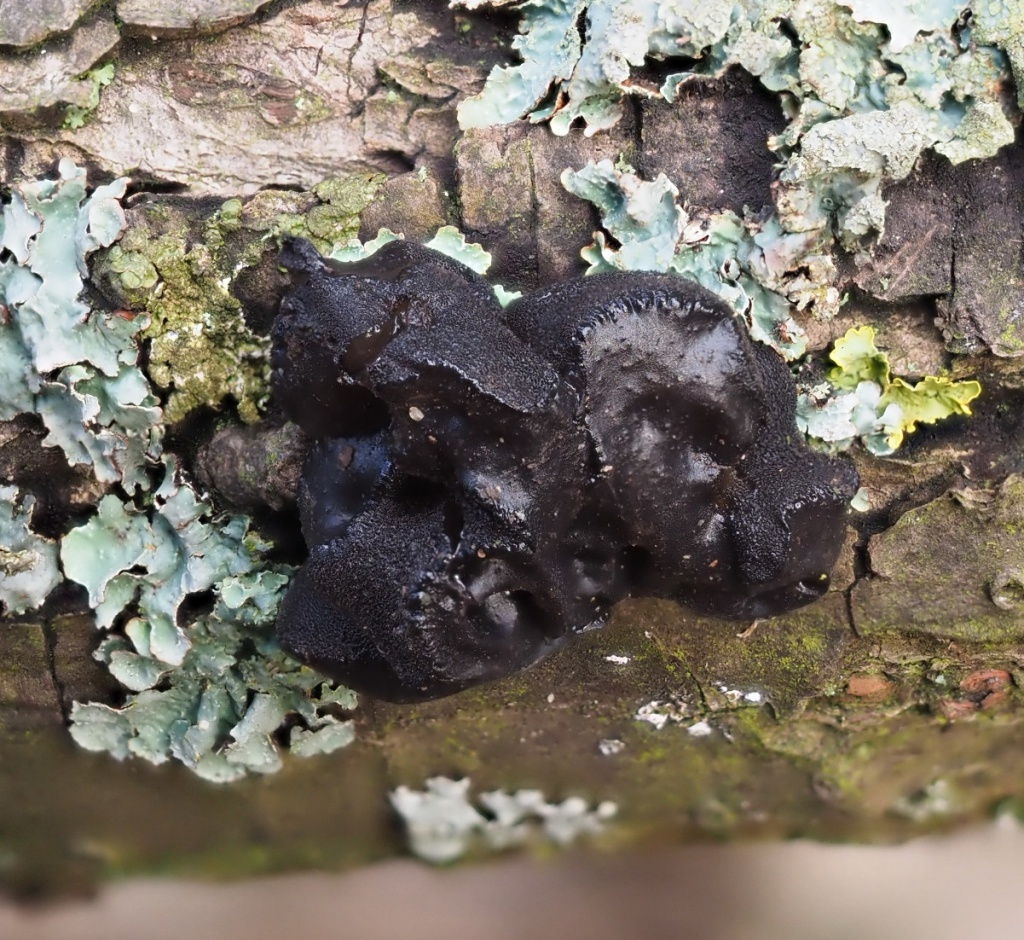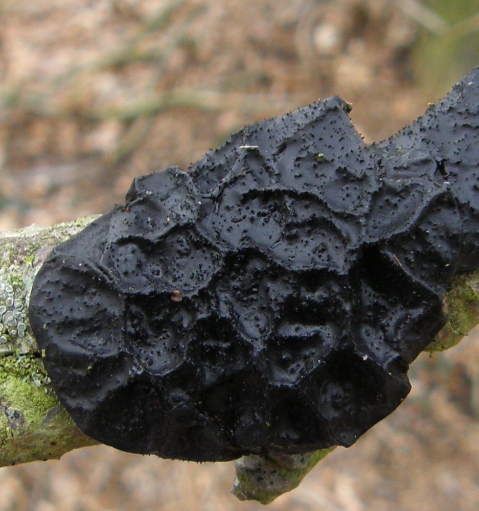 A tough jelly fungus, very dark black-brown when wet. Fruitbodies are thick, firm and shaped like discs, buttons or tops (turbinate), but may coalesce into groups of irregular blocks with flattened tops and facets. When dry it shrivels and forms an olive-brown crust over the substrate, but regains its shape and jelly-like texture when re-wetted. The brownish upper side can be matt or shiny and is hairy or scurfy. The lower (fertile) hymenium has small fine warts.