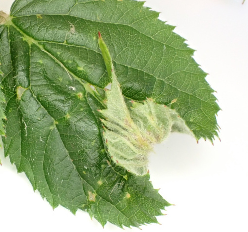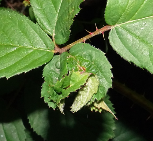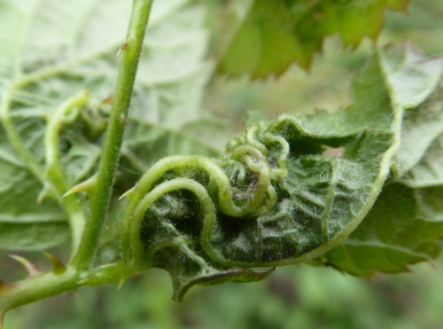The larvae of the Blackberry Leaf Midge Dasineura plicatrix cause galls to form on Bramble. The young leaf is creased, pleated or buckled with thickened veins. The larvae are present in the creases briefly in late spring or early summer. The leaf becomes black around the midrib after the larva has left.