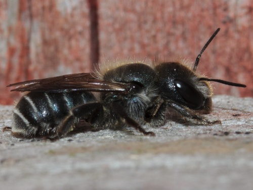 Length 8 to 10 mm. The females have large box-shaped heads and a blue metallic lustre to the abdomen giving rise to its common name, with a black pollen basket on the hind legs. The males are bronze with pale yellow hairs and a shining slope at the front of the abdomen.