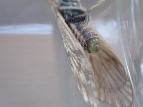 Sometimes called The Grannom. This species is the only member of the Brachycentridae family to occur in Britain. The male is smaller than the female with a forewing length of 7 to 9 mm, the female having a forewing length of 10 to 14 mm. It is a rather greyish brown with a patterning of creamy yellowish spots on the wing.