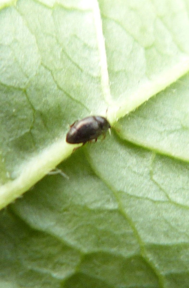 Very small - probably less than 2 mm. A dark beetle with pale legs. It has punctate head, pronotum and elytra.