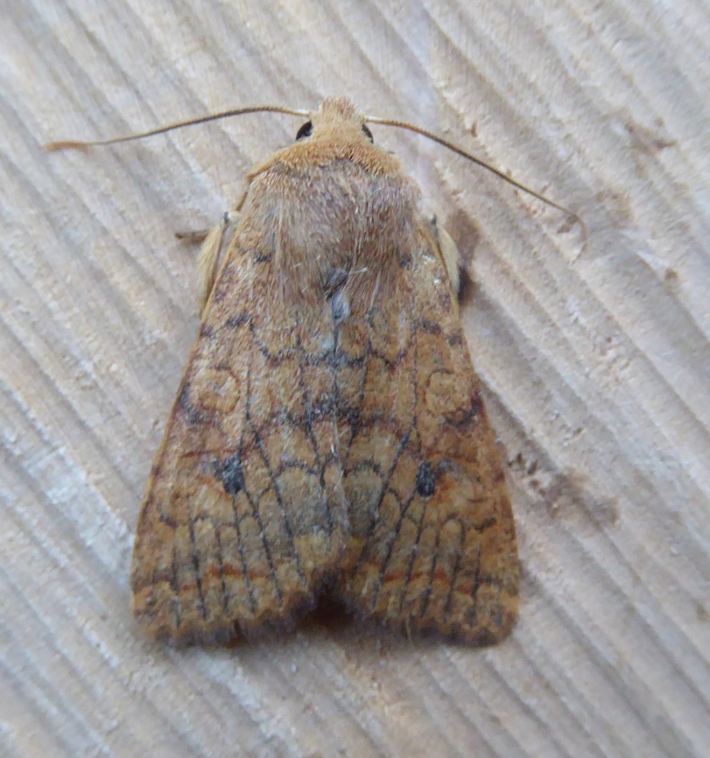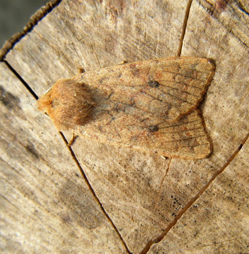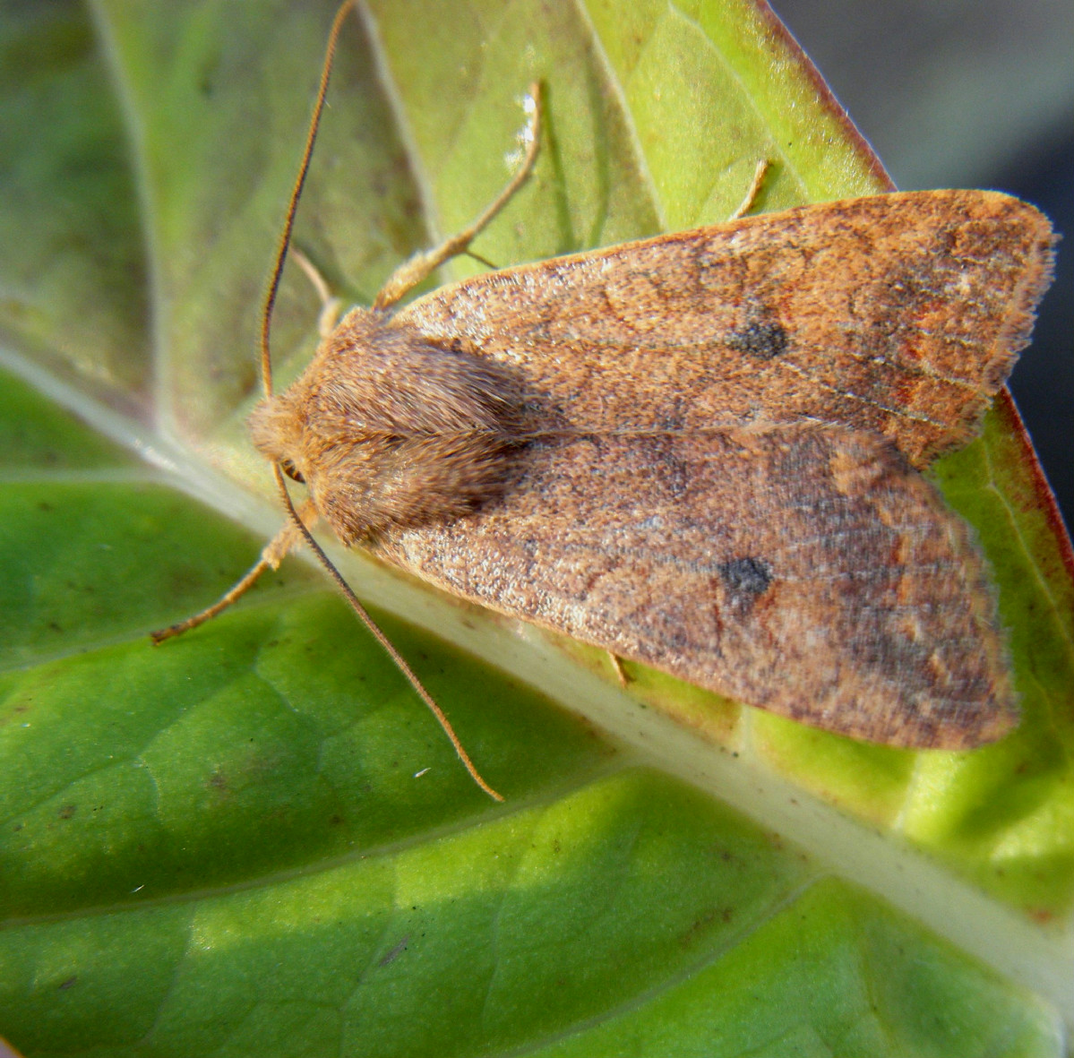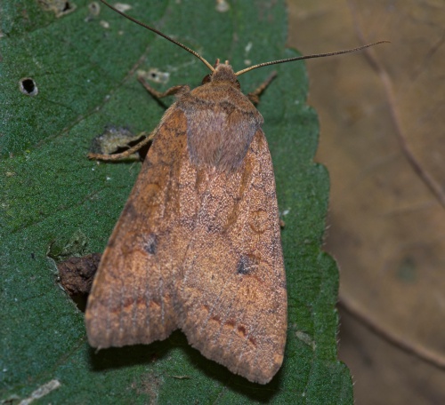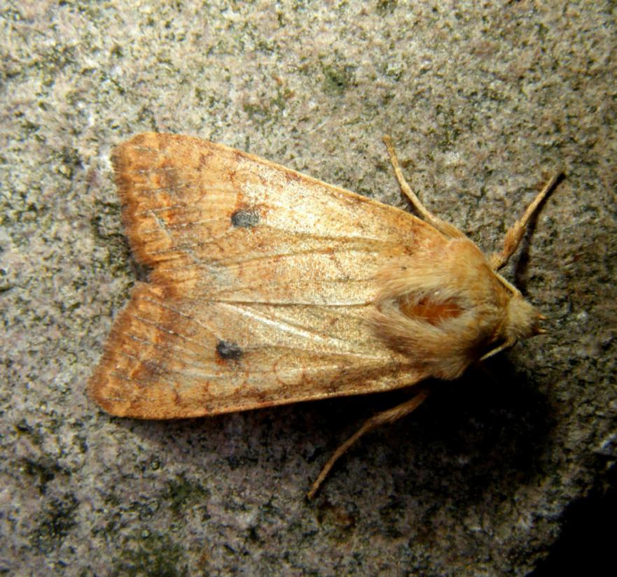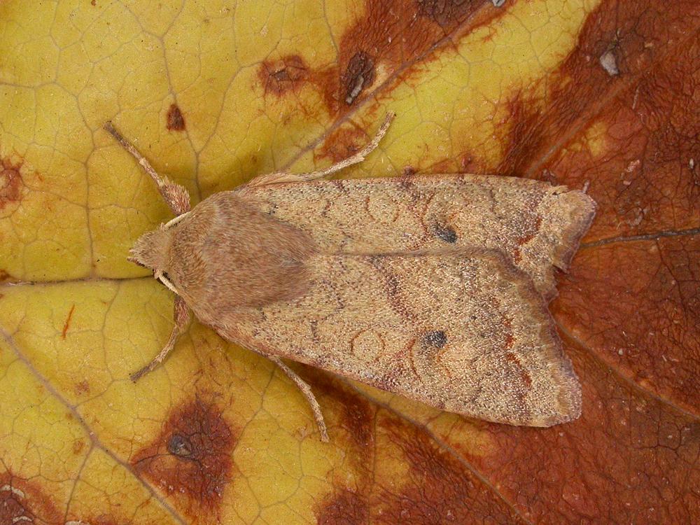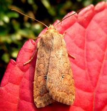 Wingspan 33-38 mm. One of several similar, orange-coloured species which emerge during the autumn period.