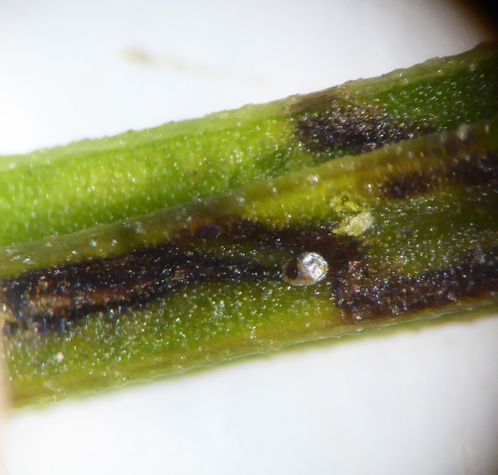 The larva of the moth Trifurcula immundella mines the stems of Broom. In this species the egg remains conspiuous at the start of the mine. The mine is a long black straight gallery, which passes down the twig initially (which enables distinction with the similar mine of Leucoptera spartifoliella). The mine then changes direction and the spaces between the ridges stain black as the mine fills them. The branches may appear stained black as the mines develop.