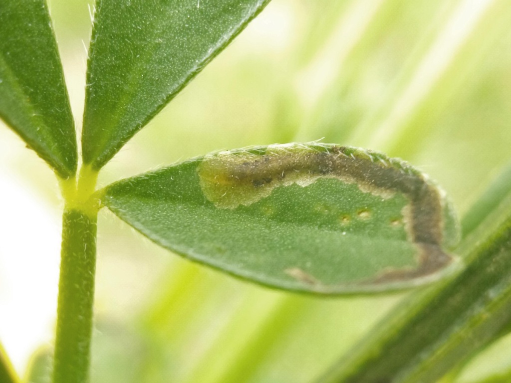 The larva of the Agromyzid fly Agromyza johannae mines the leaves of Broom and related plants. The mine is hook-like, usually along the leaf-margin and running towards the leaf apex, then turning and widening into a blotch over the mid-rib.