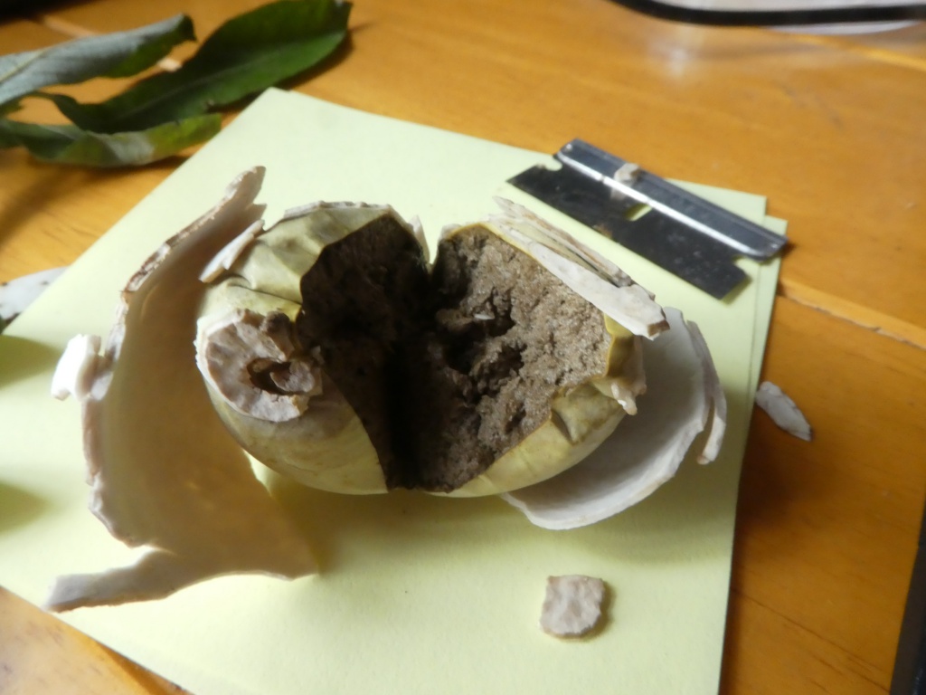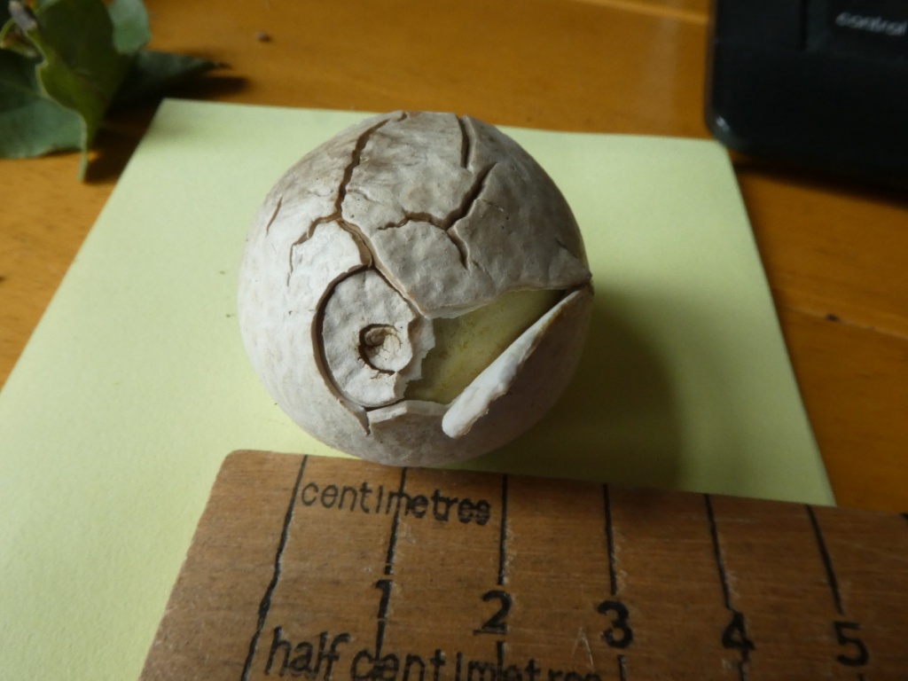 A small to medium sized puffball, up to 6cm diameter. The thick outer layer is chalky white and smooth but soon cracks and falls away to reveal the the inner dark-brown layer over the spores. Spores are dispersed via an apical pore or slit.
