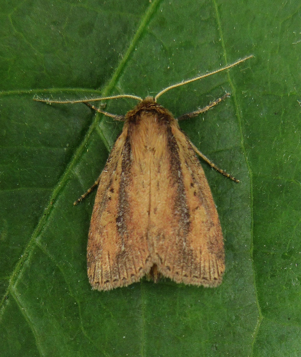 Wingspan 27 to 33 mm. The dull or reddish straw coloured forewing is dusted with grey and black and has a thick brown streak emanating centrally from the base. In the female this streak is restricted to the base but in the male it extends to the outer edge, broadening as it does so.