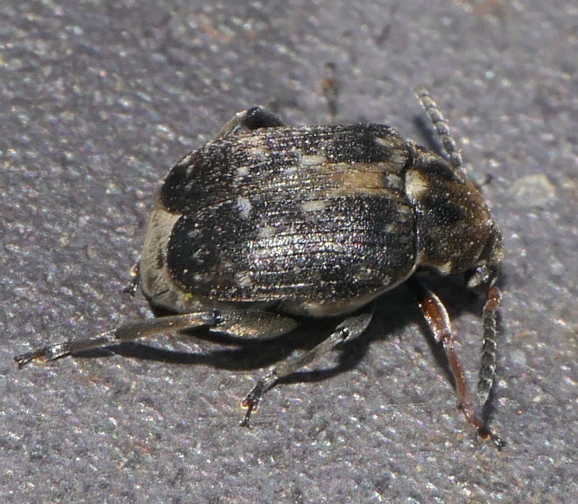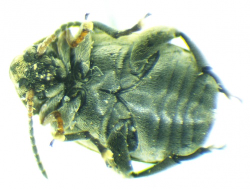 2.5-3.6mm. Dense pale patch at rear of pronotum and centrally on suture of elytra. Several other smaller pale patches. Leg colour is same as the basic colour except front femur and tibia which are orange.Males possess a sub-apical tooth on the mid tibia, located away from the apical angle.