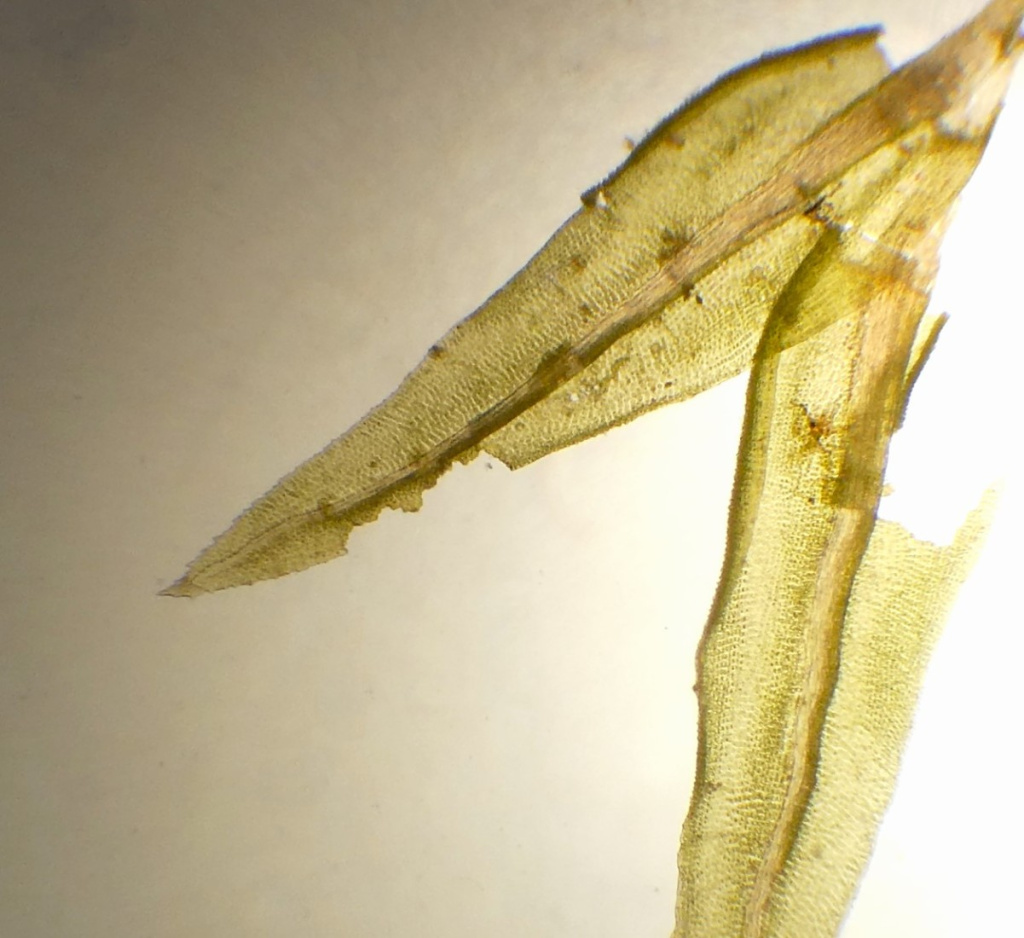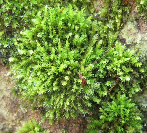 A. androgynum forms small, pale, dull green tufts. Many shoots terminate in an elongated stalk with a ball of gemmae at the top. Shoots are 3 to 4 mm tall (excluding the elongated stalk and ball of gemmae). The leaves appress and overlap each other, are typically 1 to 2 mm long, and broadly spearhead shaped, shortly pointed and not shiny. Capsules are very rare. The gemmae on long stalks, coupled with its growing on dead wood distinguish A. androgynum from all other species.