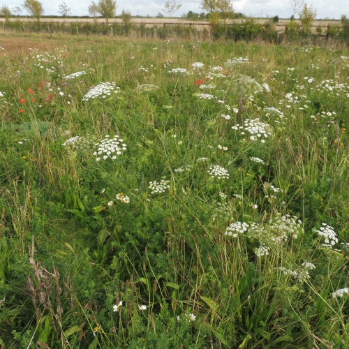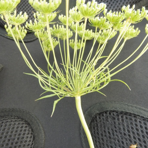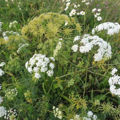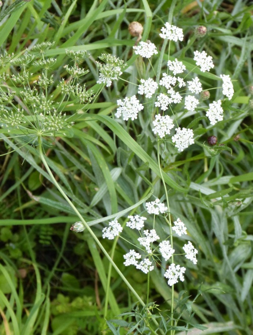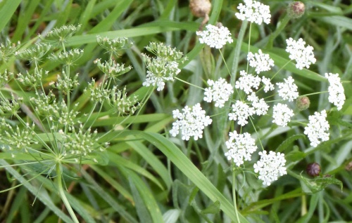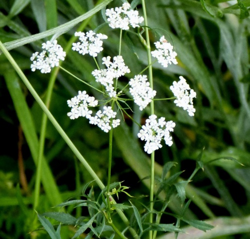 Ammi majus is tall, branching plant with 2 to 3-pinnate leaves and large compound umbels of small white flowers.
