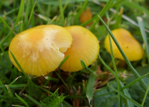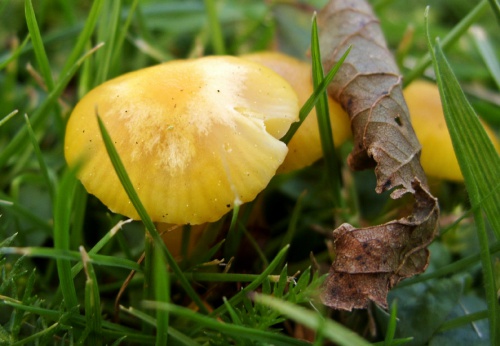 It is often confused with Golden Waxcap, which is found in similar habitats; Golden Waxcaps are often taller and larger than Butter Waxcaps, but size and shape and colour of both species is very variable. Gill attachment and texture of cap/stipe are the most helpful characteristics.