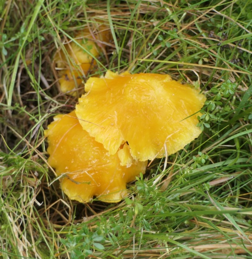 Golden Waxcap, Hygrocybe chlorophana, has a sticky, not a greasy, cap, and gills are narrowly attached (adnate) to stipe. There are several other species of yellow waxcaps