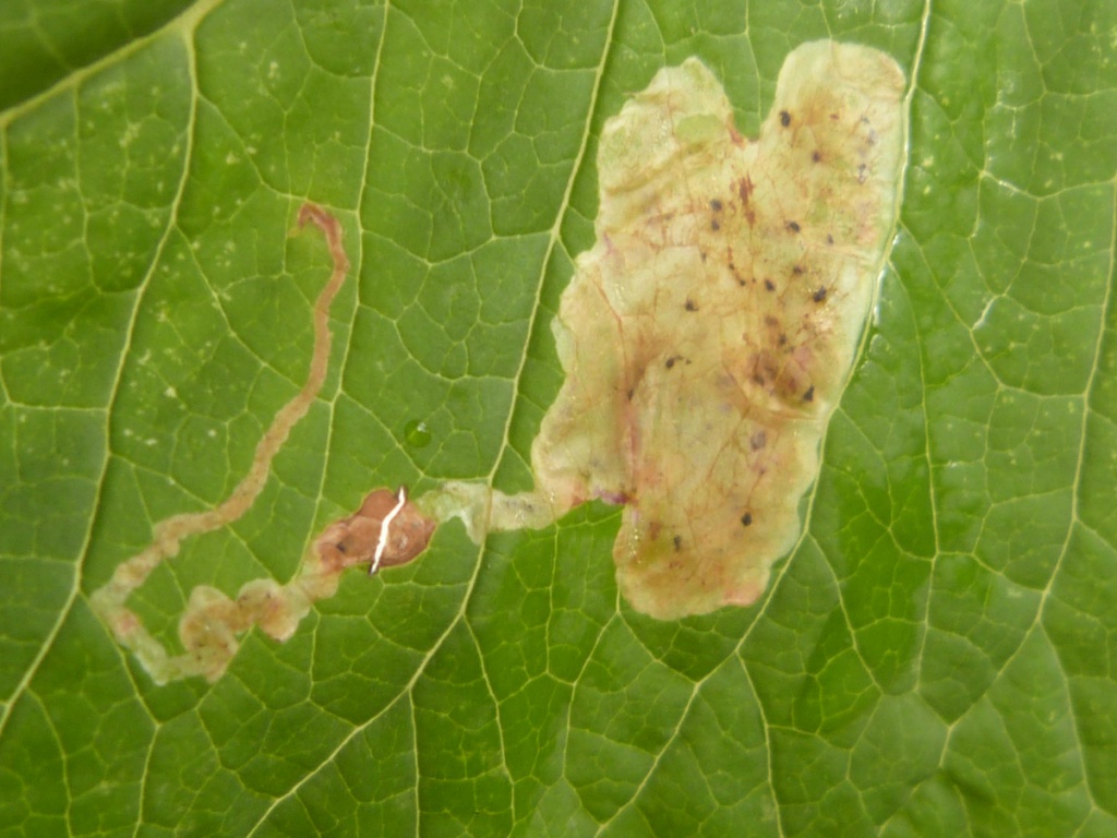 The larva of the Agromyzid fly Amauromyza verbasci causes a blotch mine on the upper surfaces of the leaves of Mullein, Common Figwort and Butterfly-bush. The mine is pale initially but turns brown later. Frass in sizeable dispersed grains.