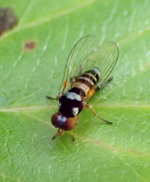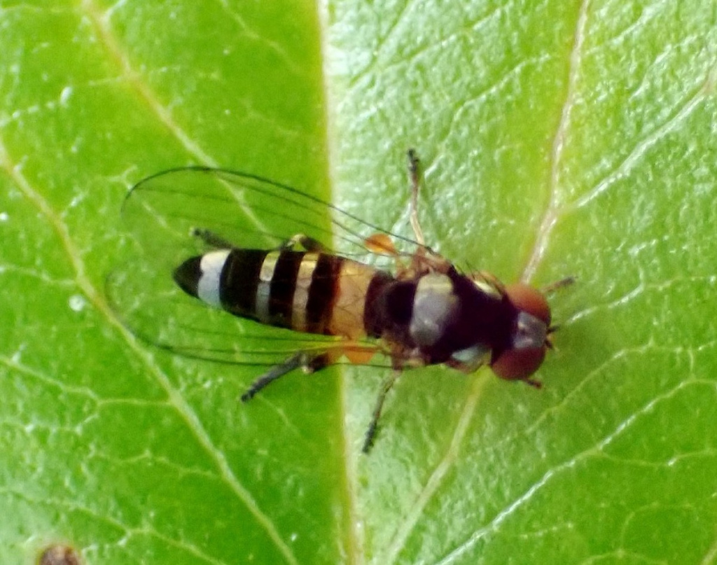 The long thin abdomen is somewhat variable but consists of amber and black with silvery white bands. The thorax is also usually black with silvery markings.
