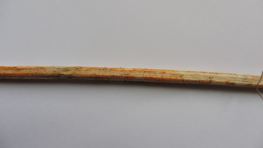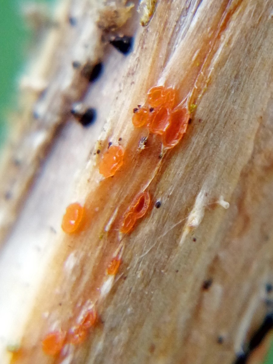 The sexual stage is a very small (< 1mm) orange disc or lens shaped fungus with a paler margin, found in clusters on dead nettle stems. The asexual stage is more often recorded, and precedes the sexual stage. This asexual stage is poorly defined and cushion-shaped, ofen coalescing, and is a darker orange. It produces chains of cylindrical conidia.