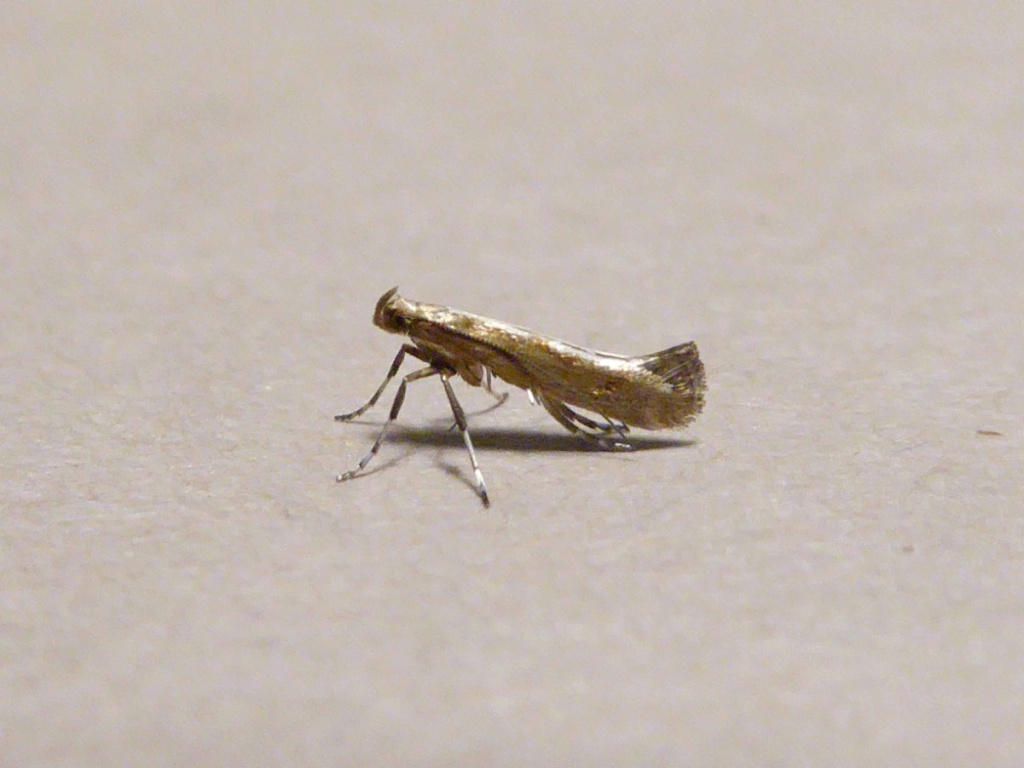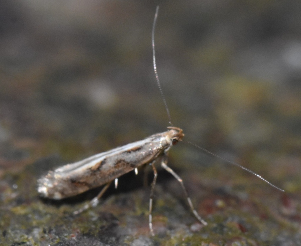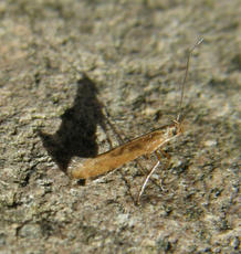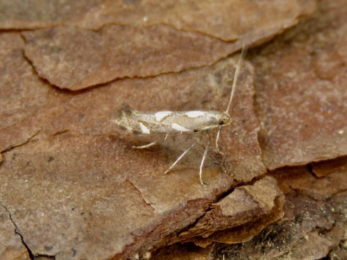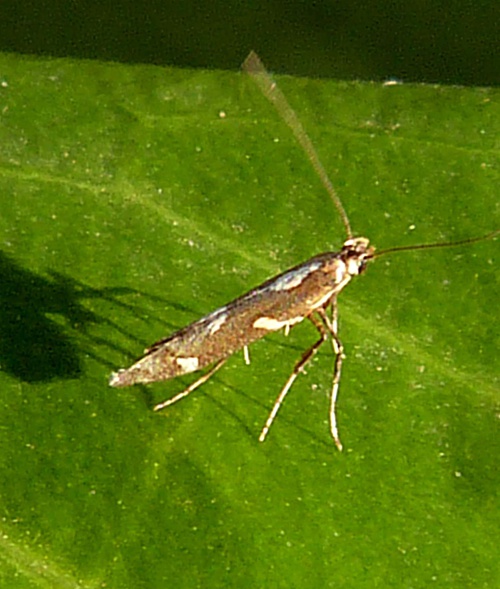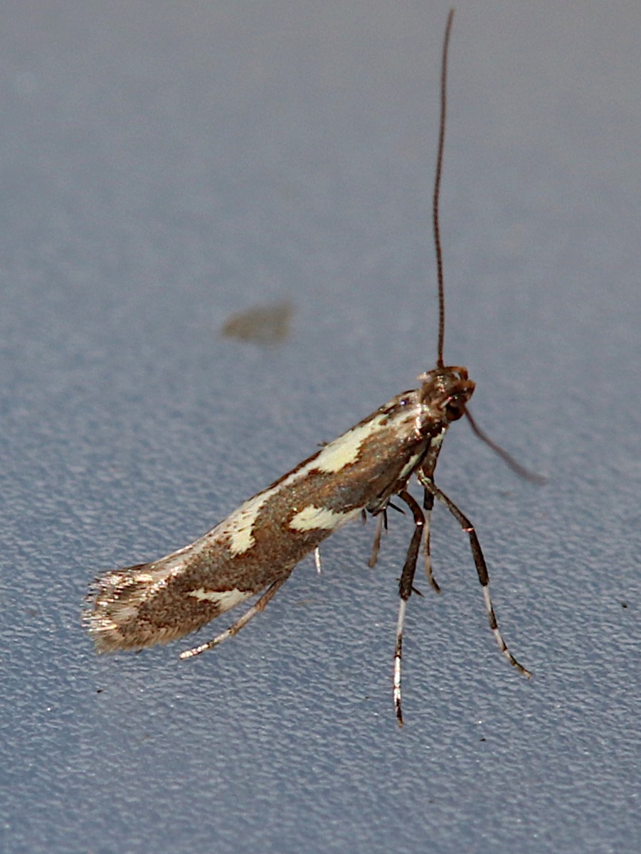 Wingspan 10 to 11 mm. Two forms occur, the typical one with a large dorsal streak and reduced paler markings elsewhere, and f. quadruplella with four large creamy or whitish markings. There are also intermediates.