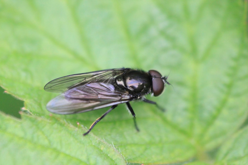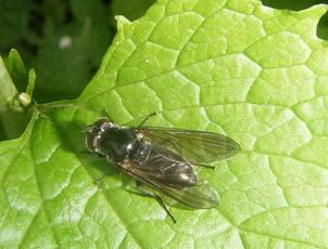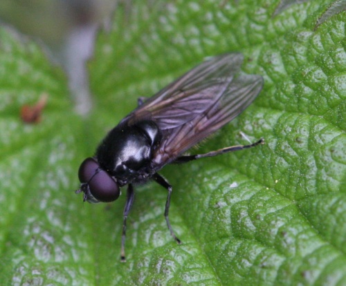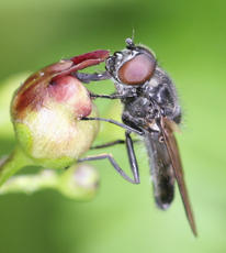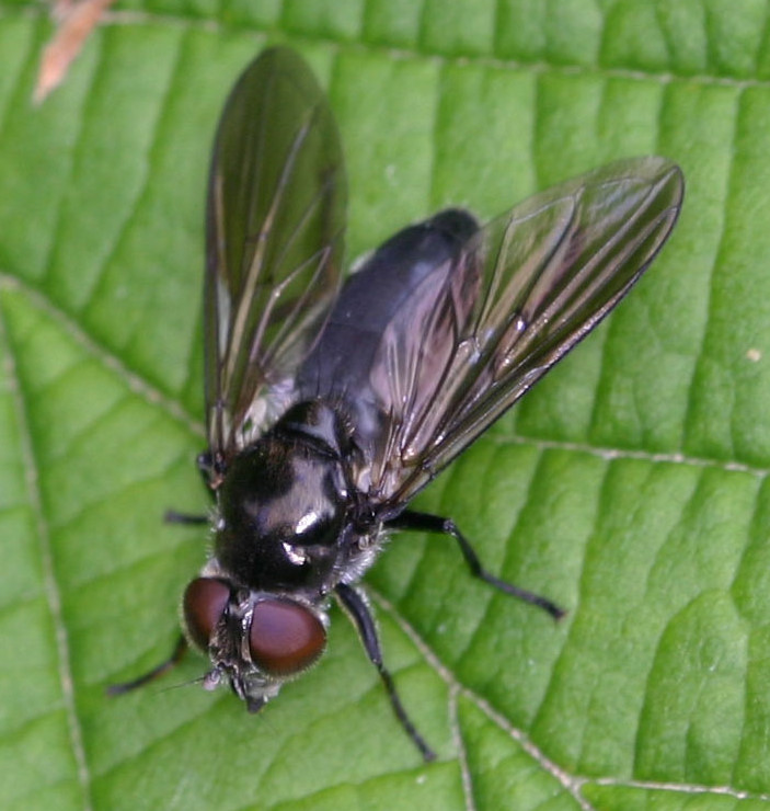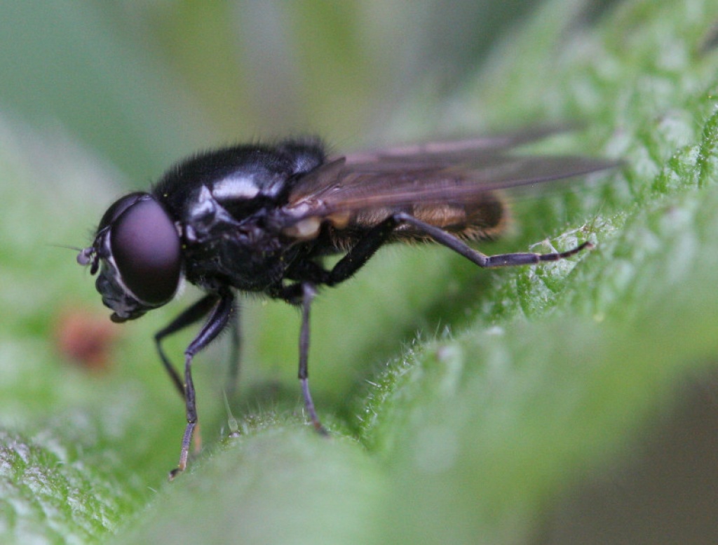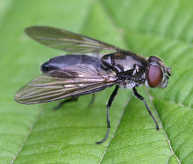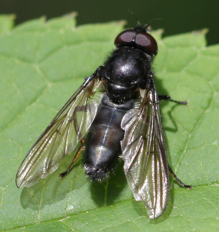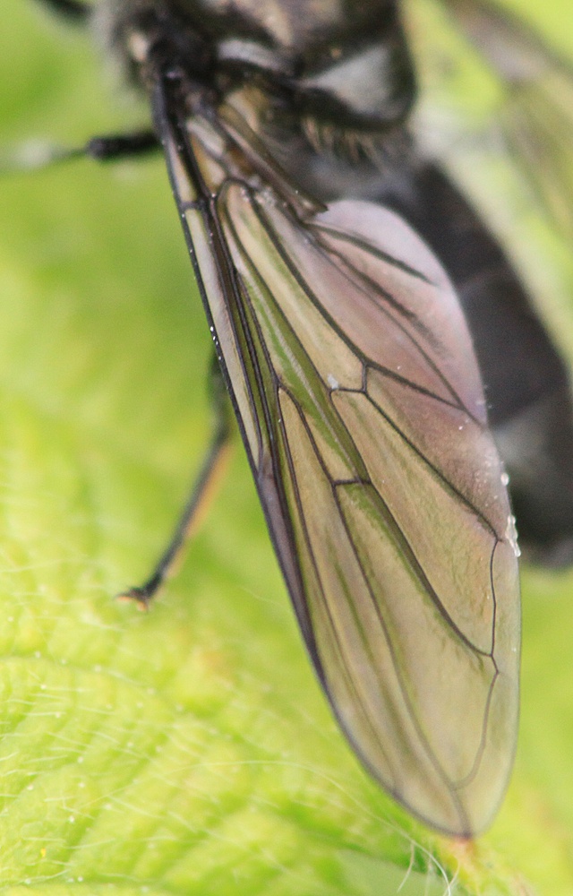 This species has an elongate, rather parallel sided grey abdomen and black thorax. It is relatively large, and has dark wings.