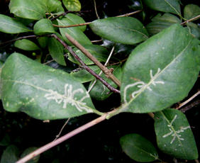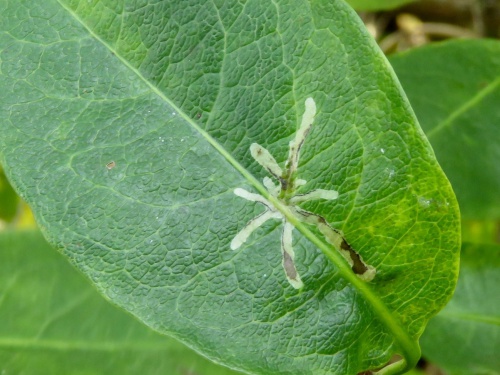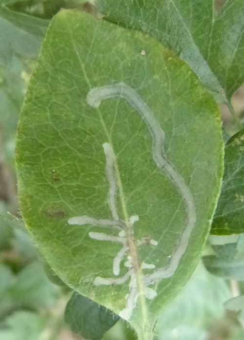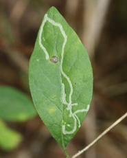 The larvae of Chromatomyia aprilina mine the leaves of Honeysuckle, forming a long corridors which radiate from the midrib on the upper leaf surface. In winter the mine may not be associated with the midrib. Frass occurs in long strips along the edges of the corridor.