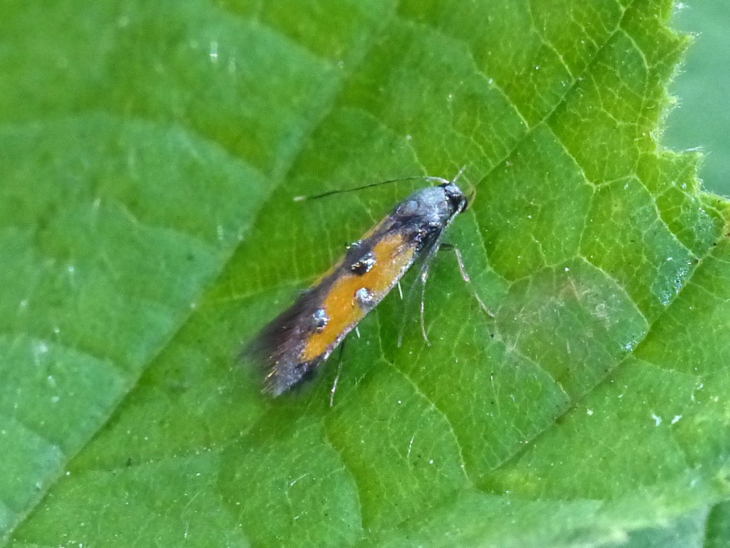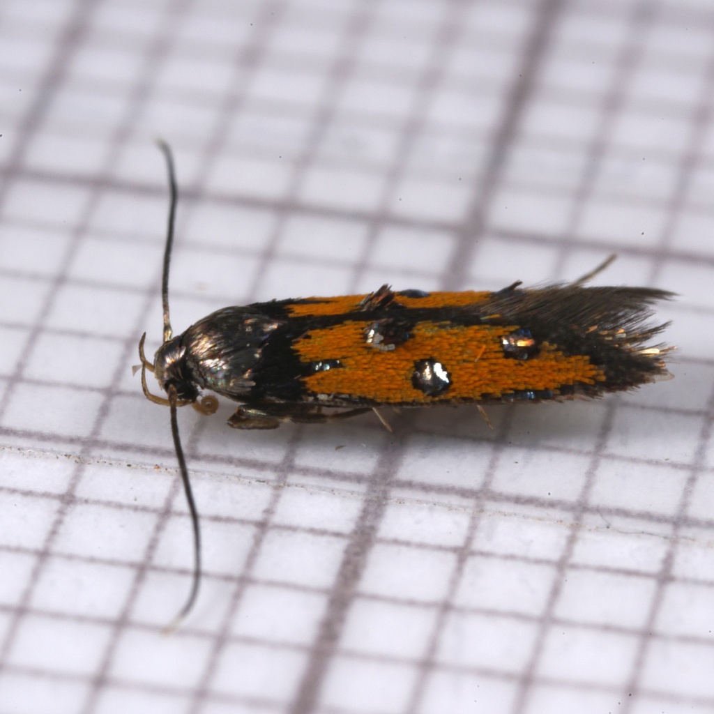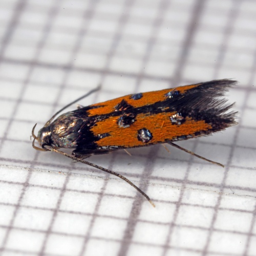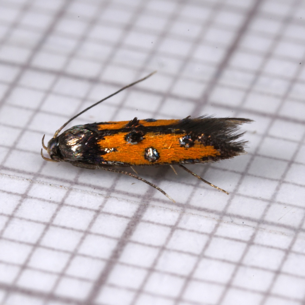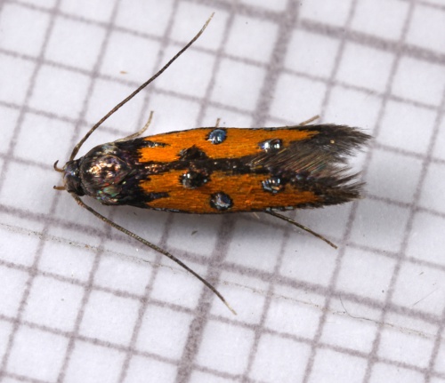 Wingspan about 12mm. An attractive species, sporting metallic leaden blotches against a bright orange ground colour.