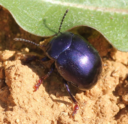 This is a beautiful species, the head, pronotum and elytra are metallic purple. It superficially resembles Timarcha goettingensis, but whilst the femora and tibiae of Chrysolina sturmi are metallic purple, the tarsi are orange-brown.
