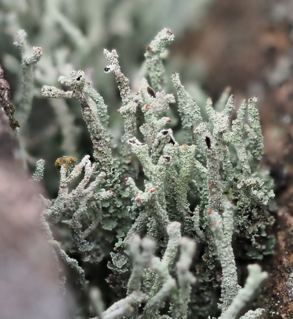 A variable Cladonia with grey, many-branched podetia which have squamules at the bottom and are farinose or sorediate at the top. Fruiting cups are sometimes present and these are bright red.