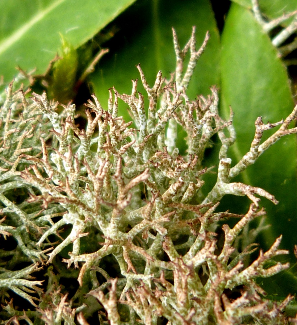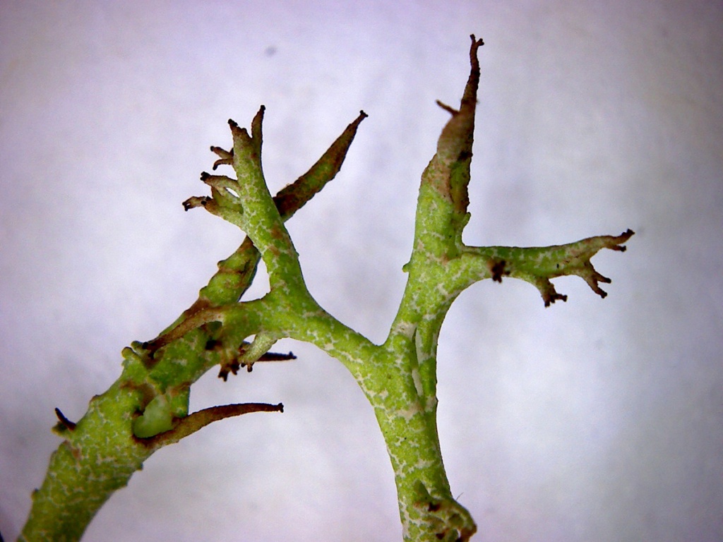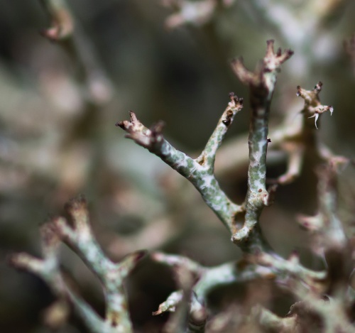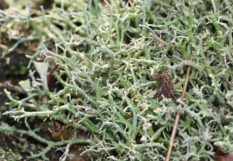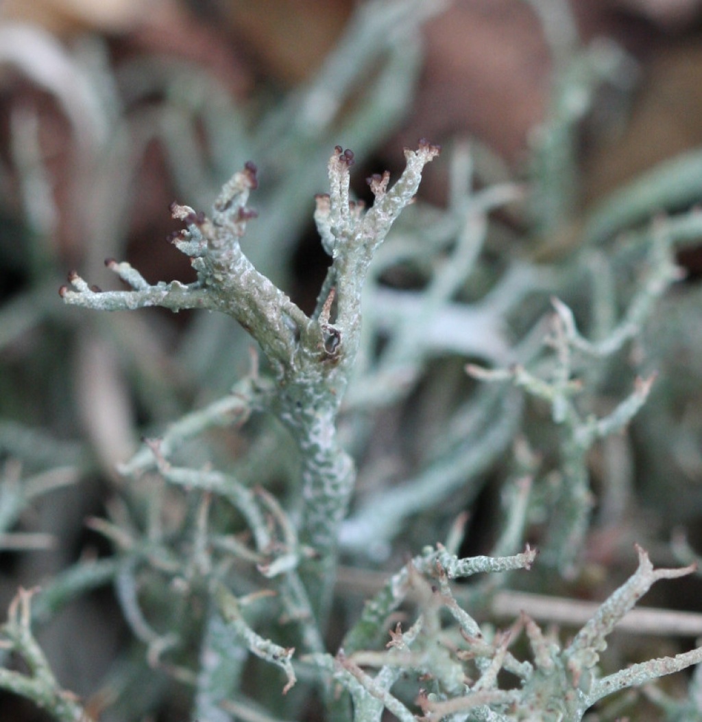 Podetia are greyish, richly branched, commonly terminating in spiky tufts with pointed, dark ends. The surface of the podetia appearing speckled, with groups of green algal cells on a paler background, looking like the pattern on a giraffe's neck.