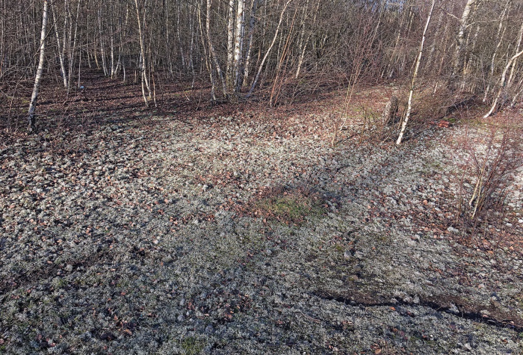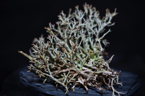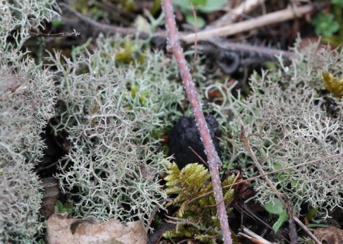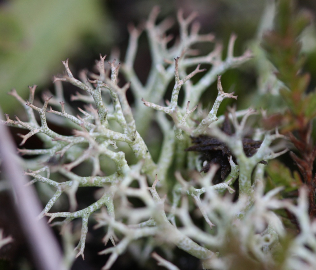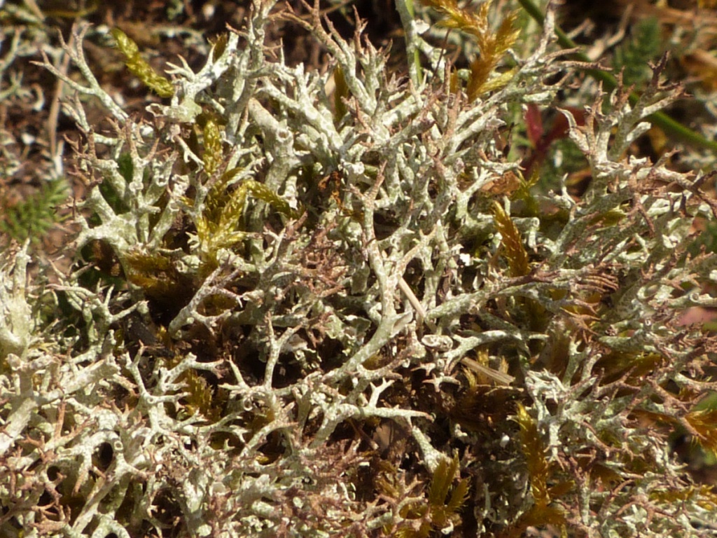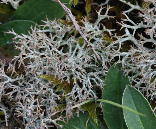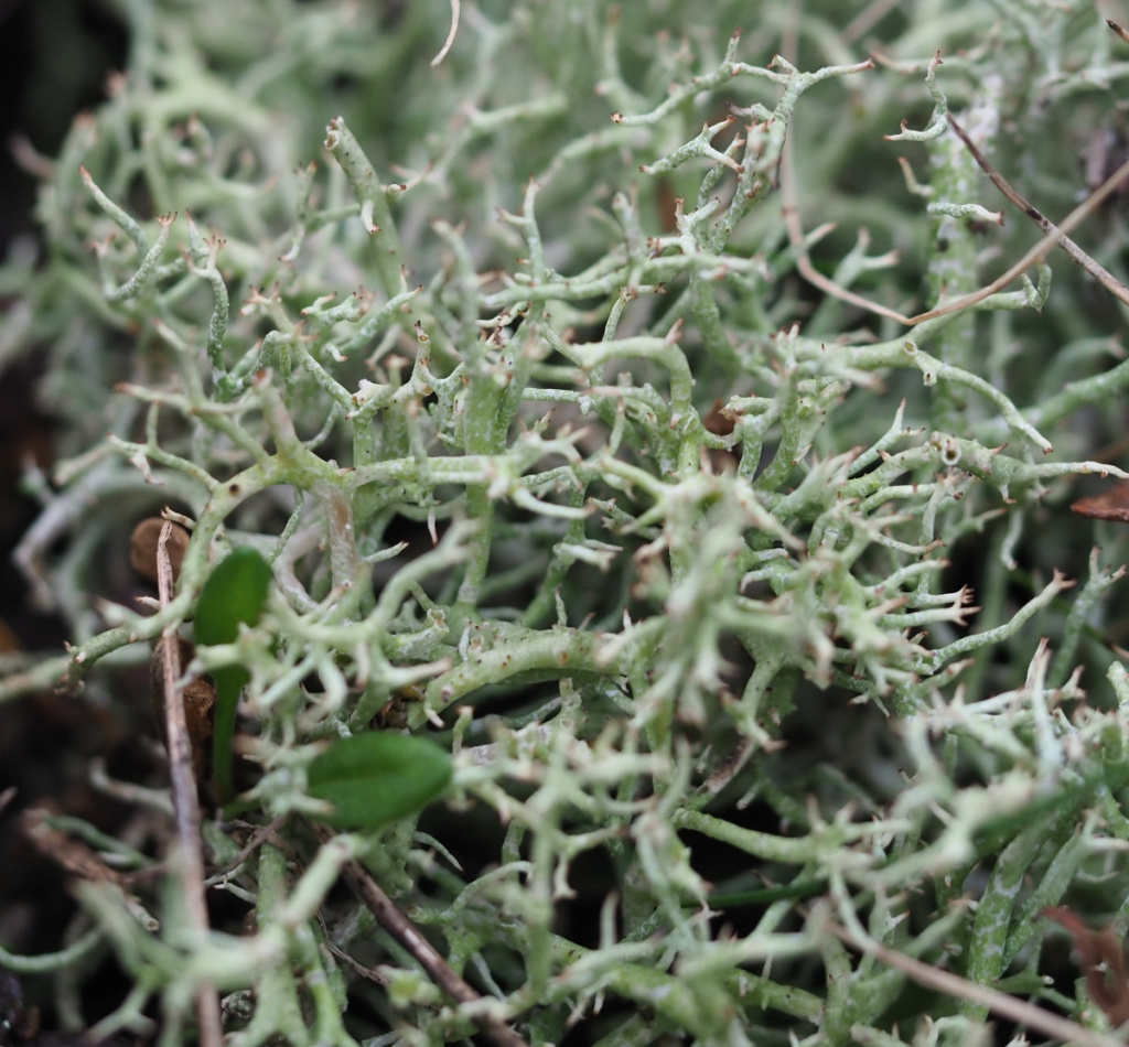 Podetia are greyish, richly branched, commonly terminating in spiky tufts with pointed, dark ends. The surface of the podetia appearing speckled, with groups of green algal cells on a paler background, looking like the pattern on a giraffe's neck.